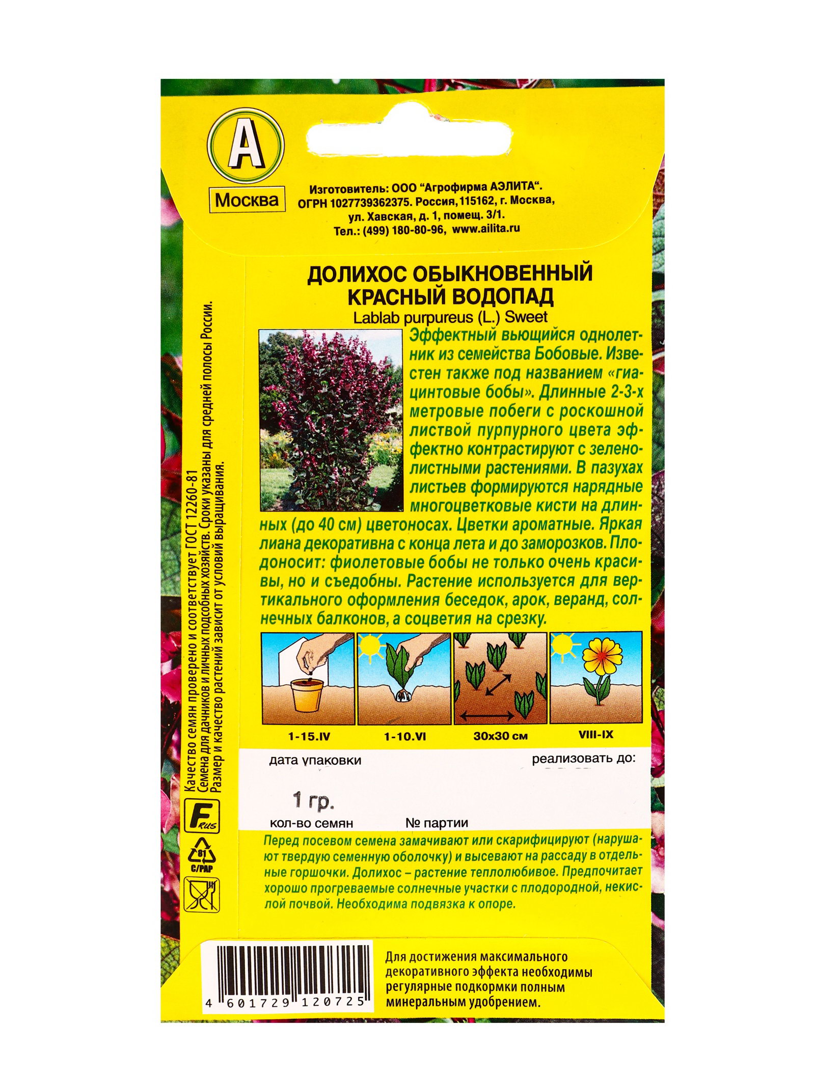 Семена цветов Долихос Красный водопад, Ц/П,1 г, Агрофирма АЭЛИТА, Китай