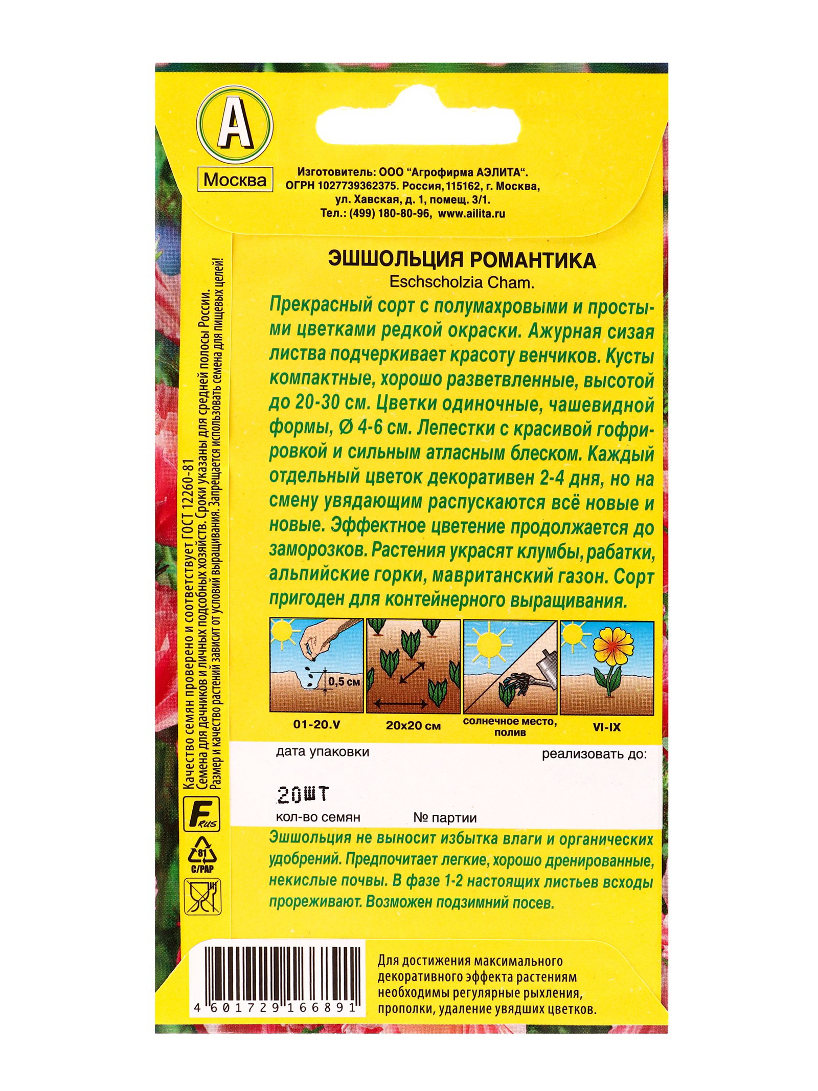 Семена цветов Эшшольция махровая Романтика, Ц/П,20 шт., Агрофирма АЭЛИТА, Нидерланды