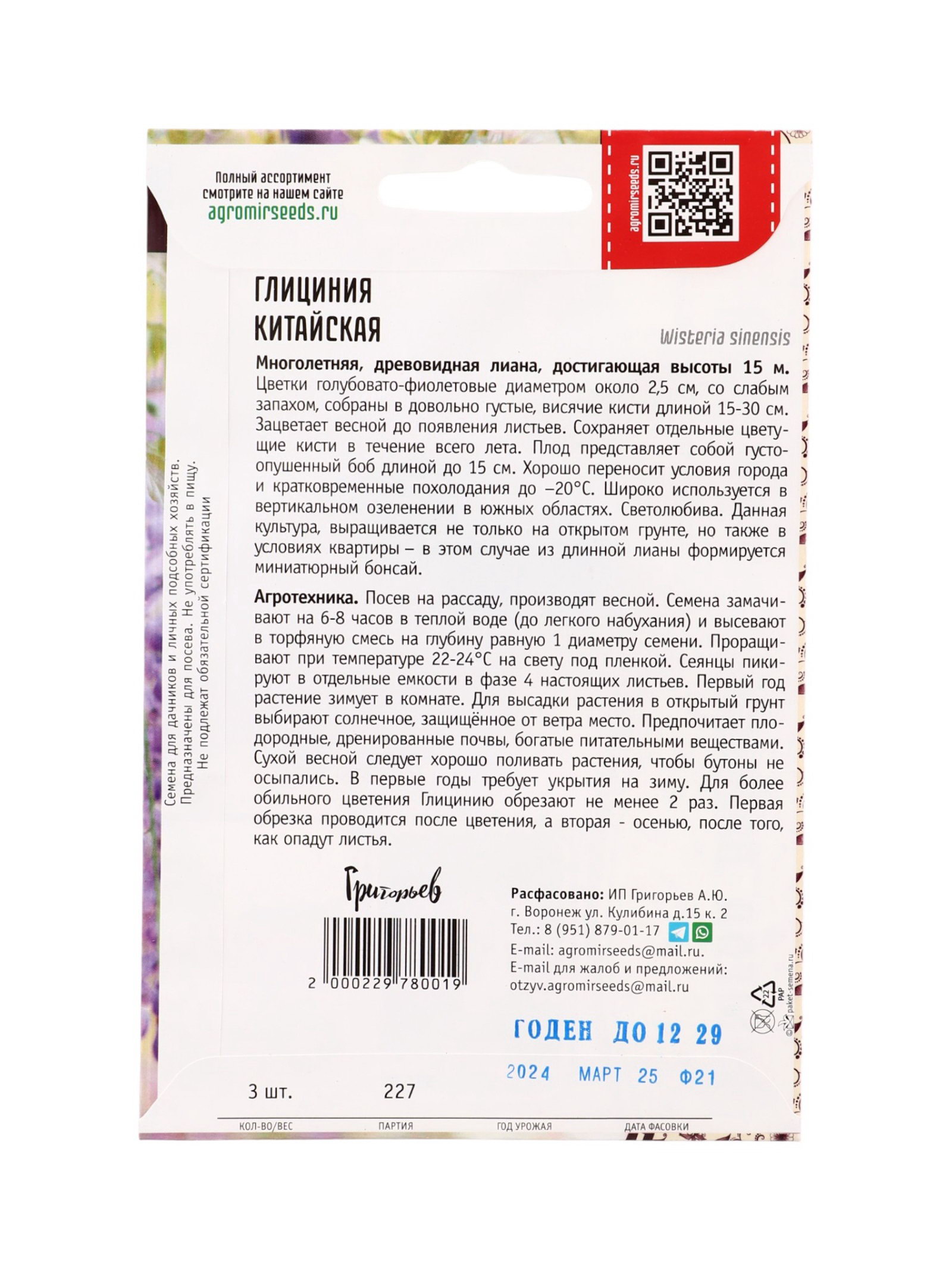 Семена цветов Глициния Китайская 3 шт. 12.29 гр, Григорьев, Россия