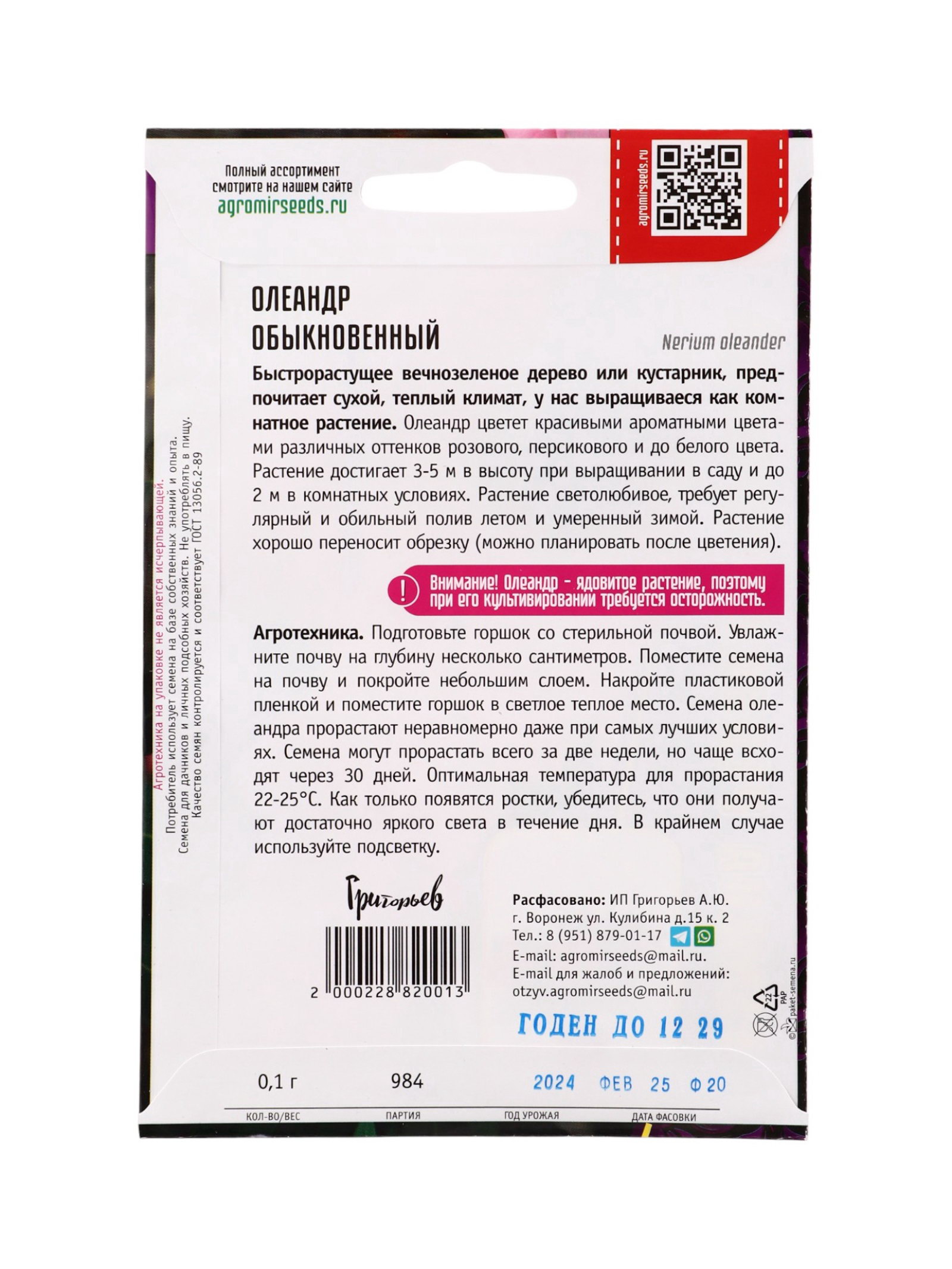 Семена Олеандр Обыкновенный 0.1г. 12.29 гр, Григорьев, Россия