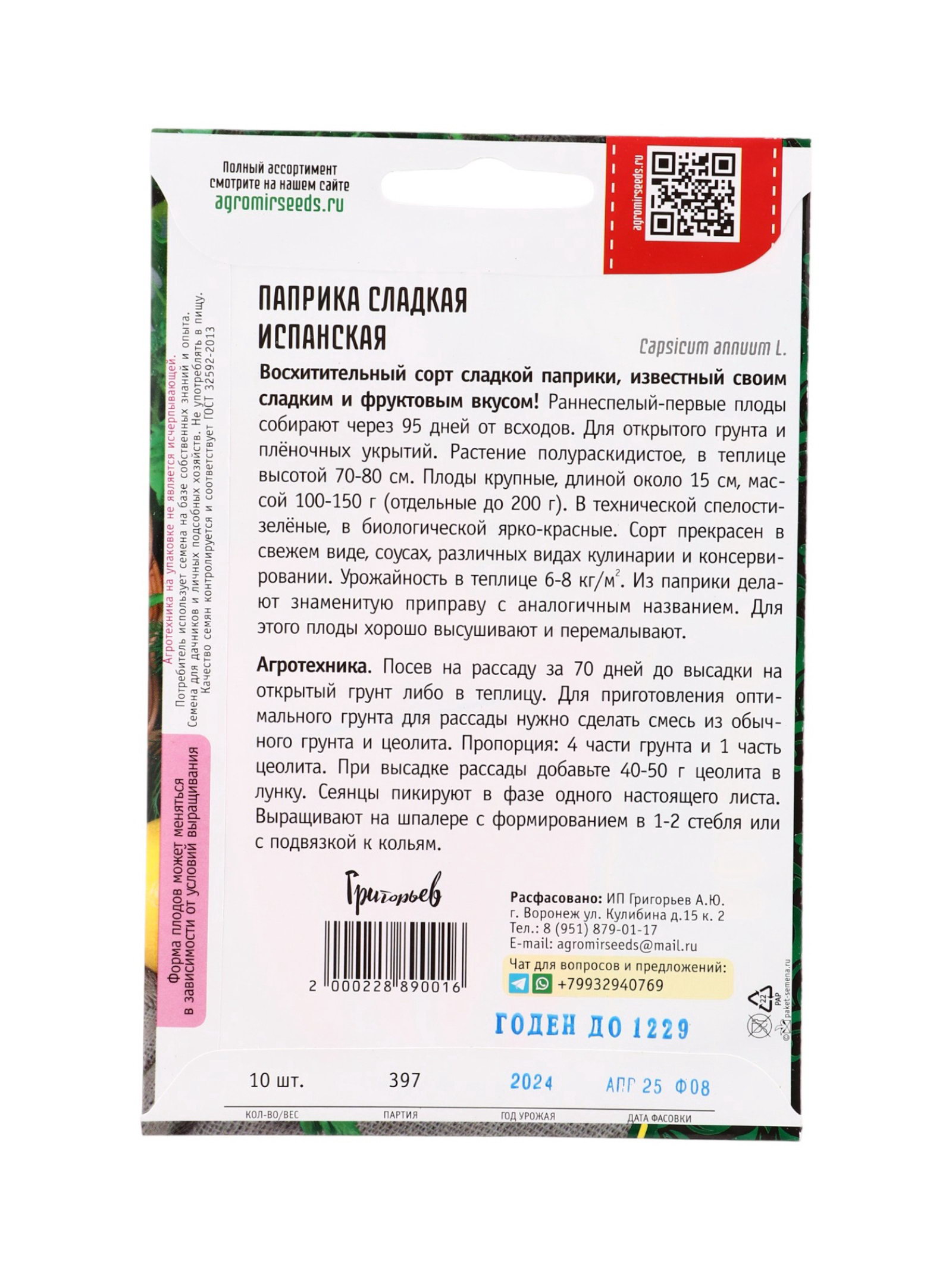 Семена Паприка сладкая Испанская 10 шт. 12.29 гр, Григорьев, Россия