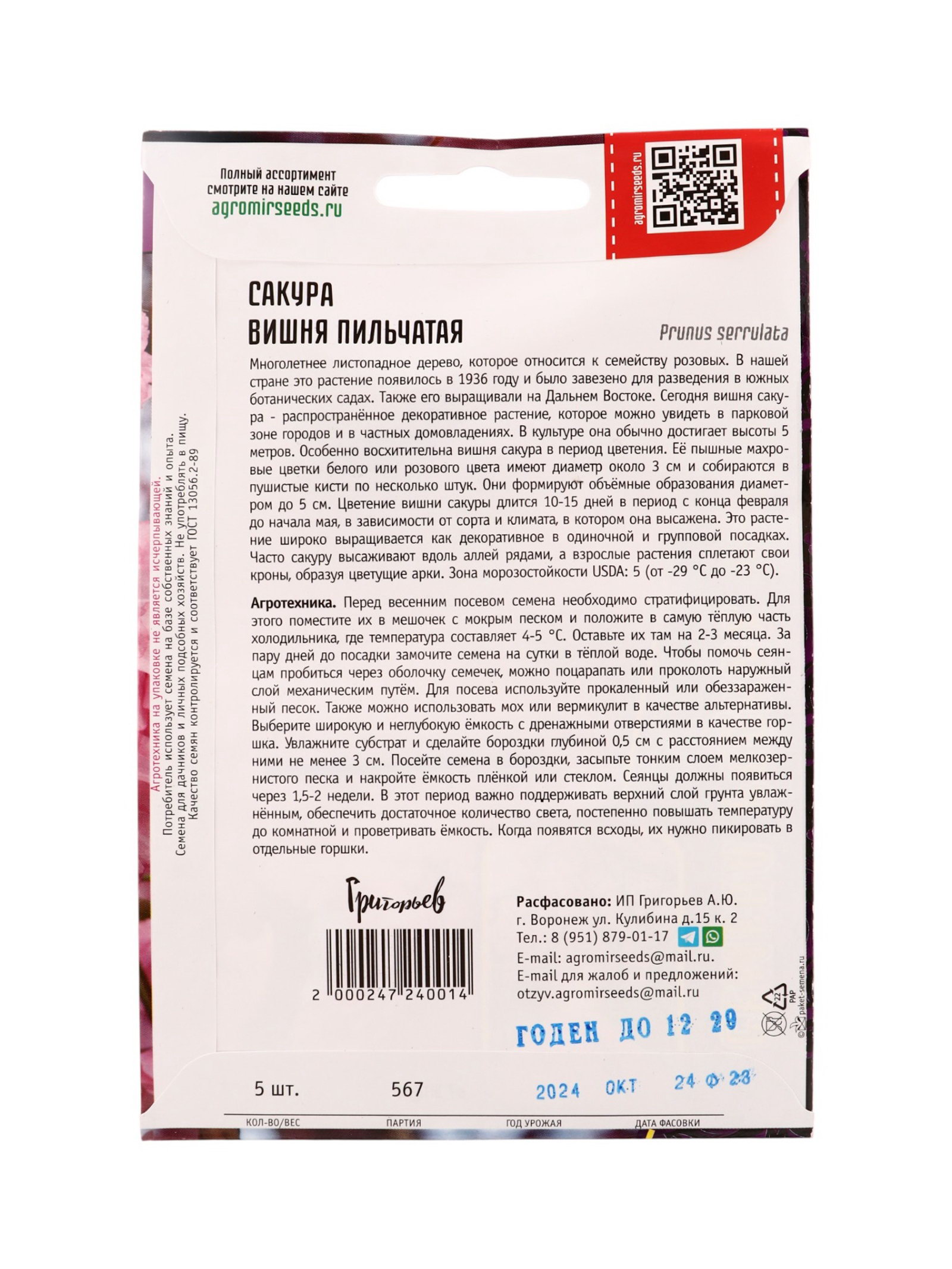 Семена цветов Сакура Вишня мелкопильчатая 5 шт. / НОВИНКА 12.29 гр, Григорьев, Россия