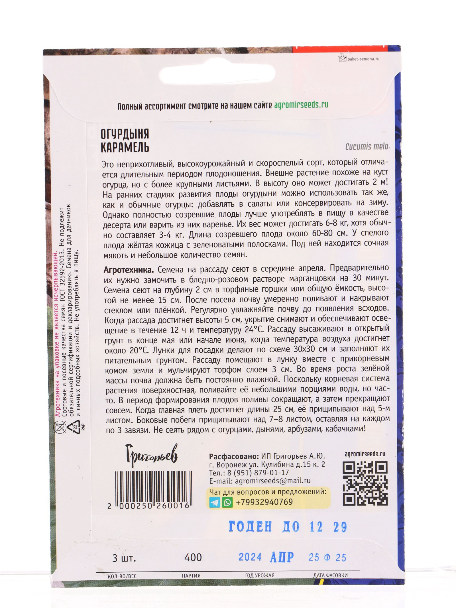 Семена Огурдыня Карамель 3 шт. 12.29 гр, Григорьев, Россия