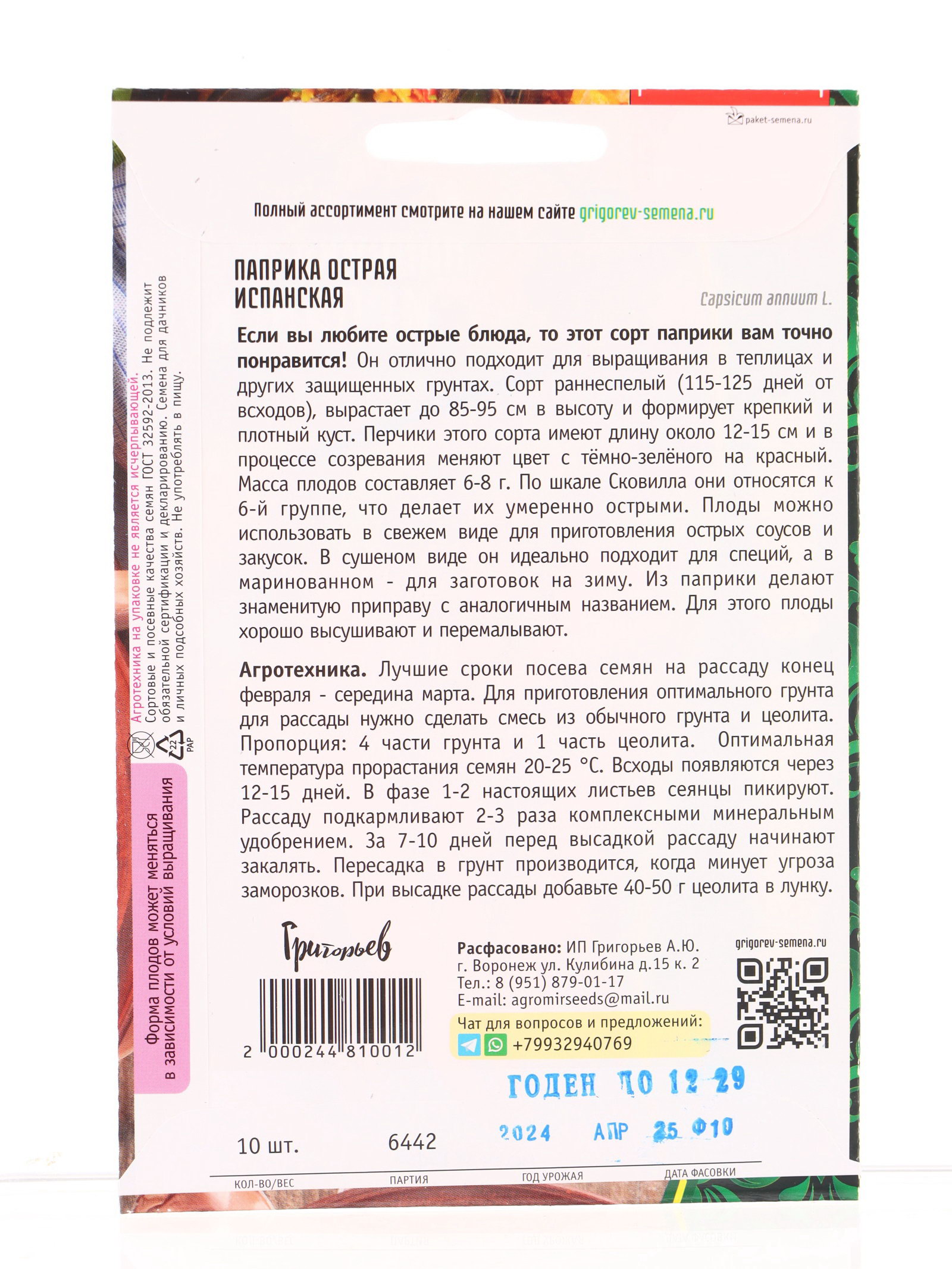 Семена Паприка острая Испанская 10 шт. 12.28 гр, Григорьев, Россия