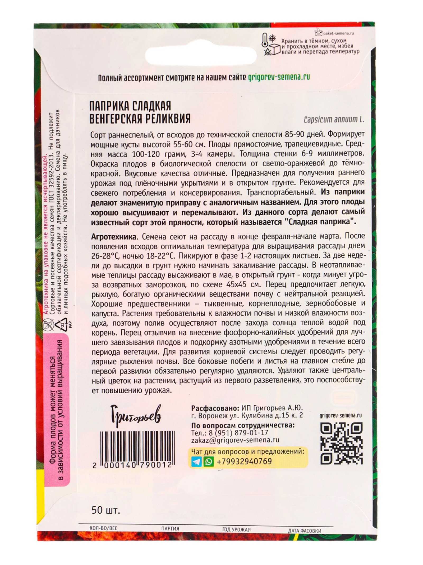 Семена Паприка сладкая Венгерская Реликвия 50 шт. 12.28 гр, Григорьев, Россия