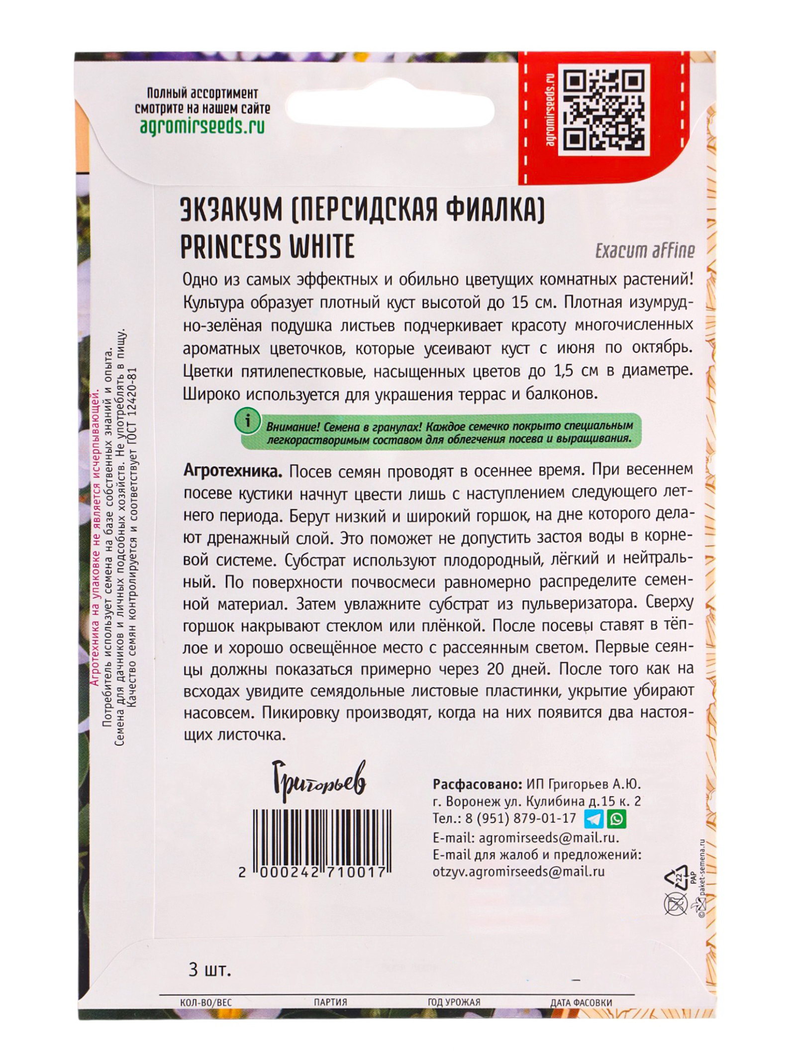 Семена Экзакум Princess White 3др. 12.2029 гр, Григорьев, Россия