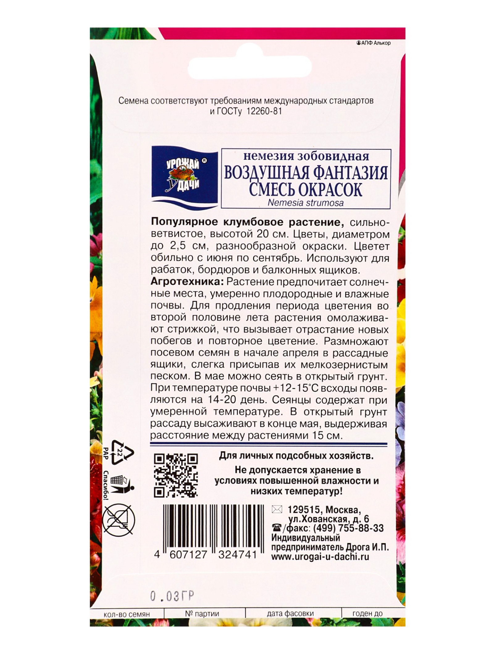Семена цветов Немезия зоб. ВОЗДУШНАЯ ФАНТАЗИЯ Смесь 0.03 гр, УРОЖАЙ УДАЧИ, Россия