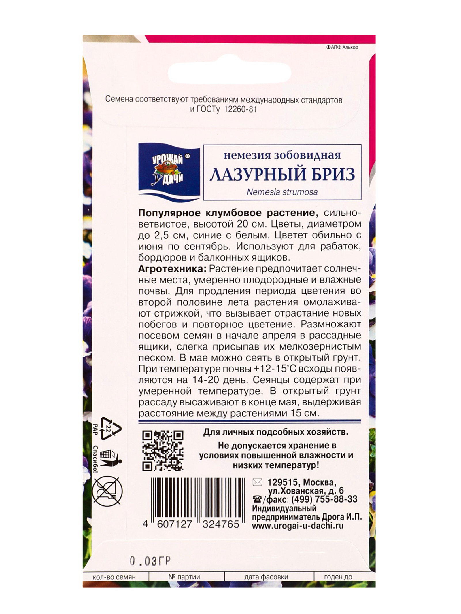 Семена цветов Немезия зоб. ЛАЗУРНЫЙ БРИЗ 0.03 гр, УРОЖАЙ УДАЧИ, Россия