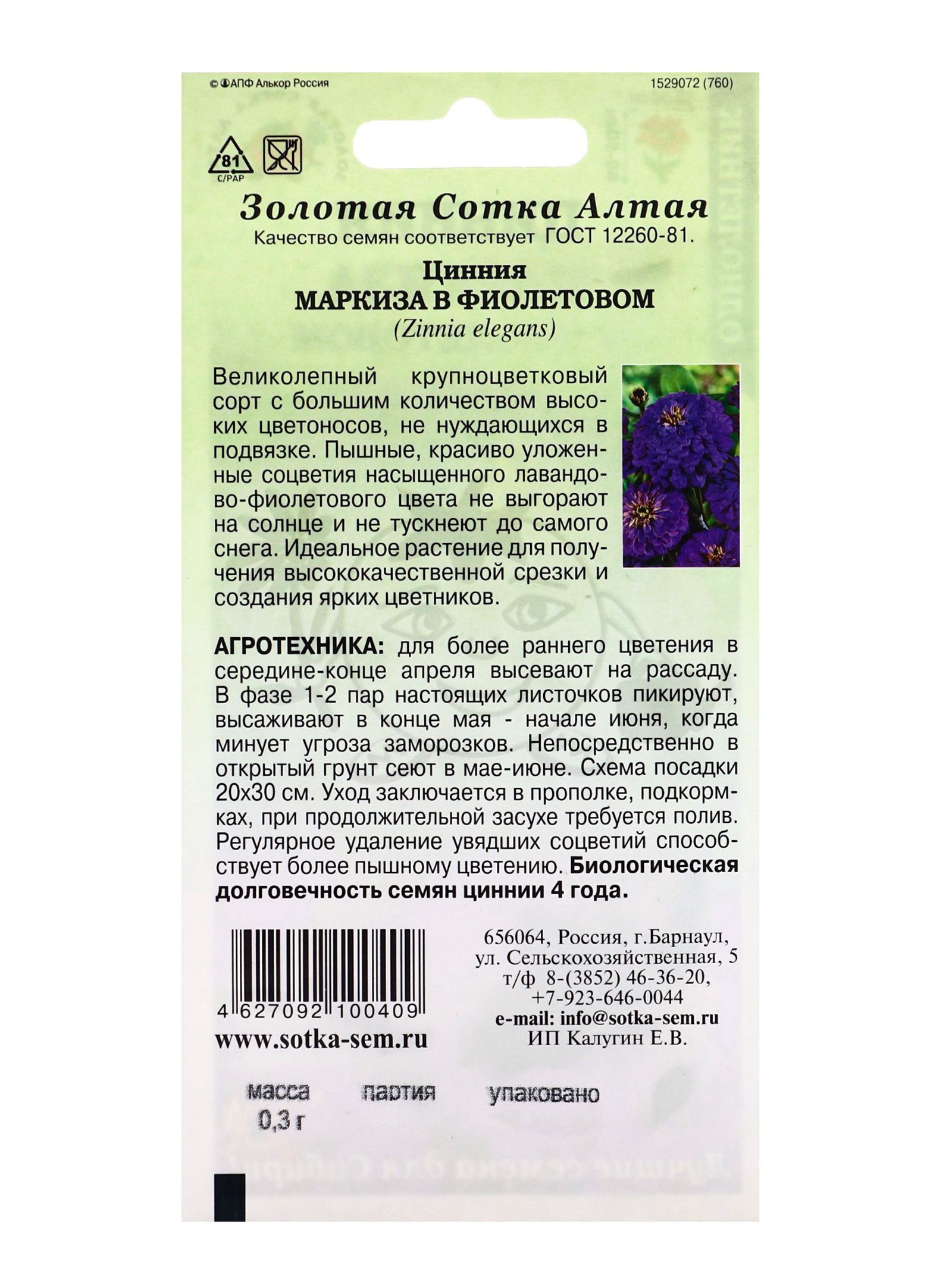 Семена цветов Цинния "Маркиза в Фиолетовом", 0.2 г, Золотая Сотка Алтая, Россия