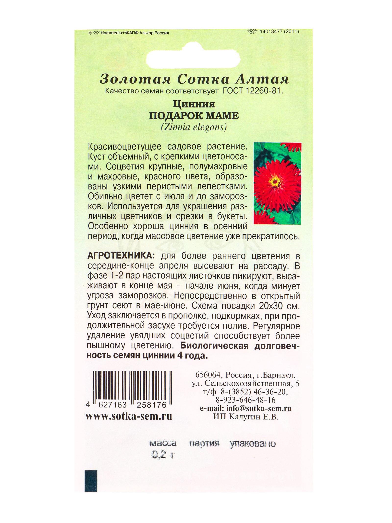 Семена Цинния "Подарок маме", 0.2 г, красная, Золотая Сотка Алтая, Россия