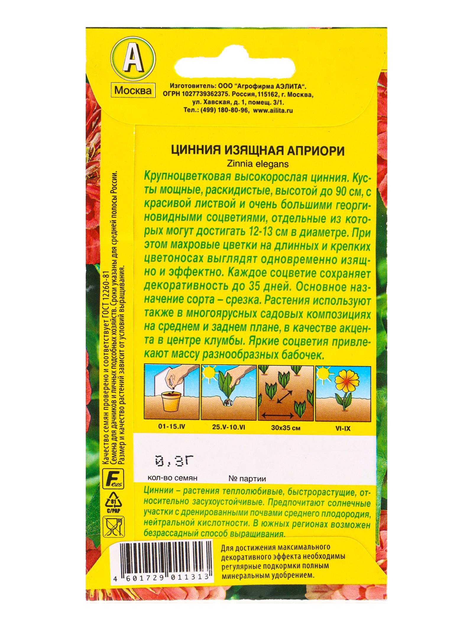 Семена цветов Цинния Априори, Ц/П,0.3 г, Агрофирма АЭЛИТА, Нидерланды