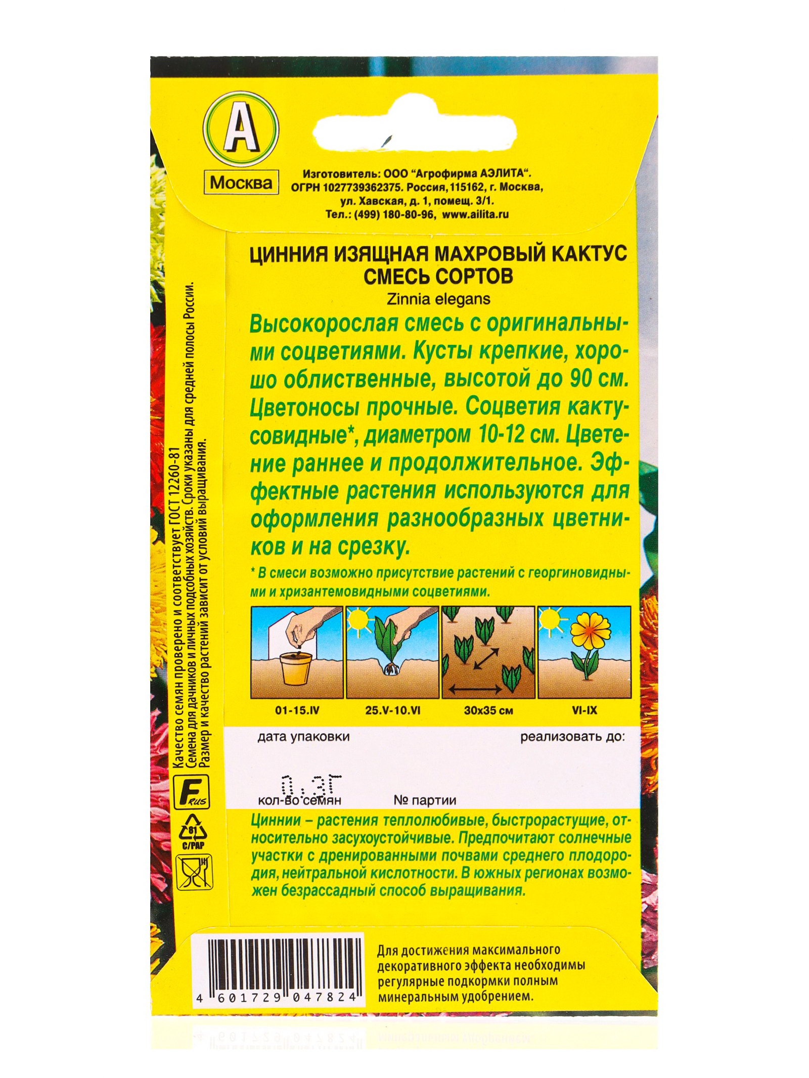 Семена цветов Цинния Махровый кактус, смесь сортов, Ц/П,0.3 г, Агрофирма АЭЛИТА, Нидерланды