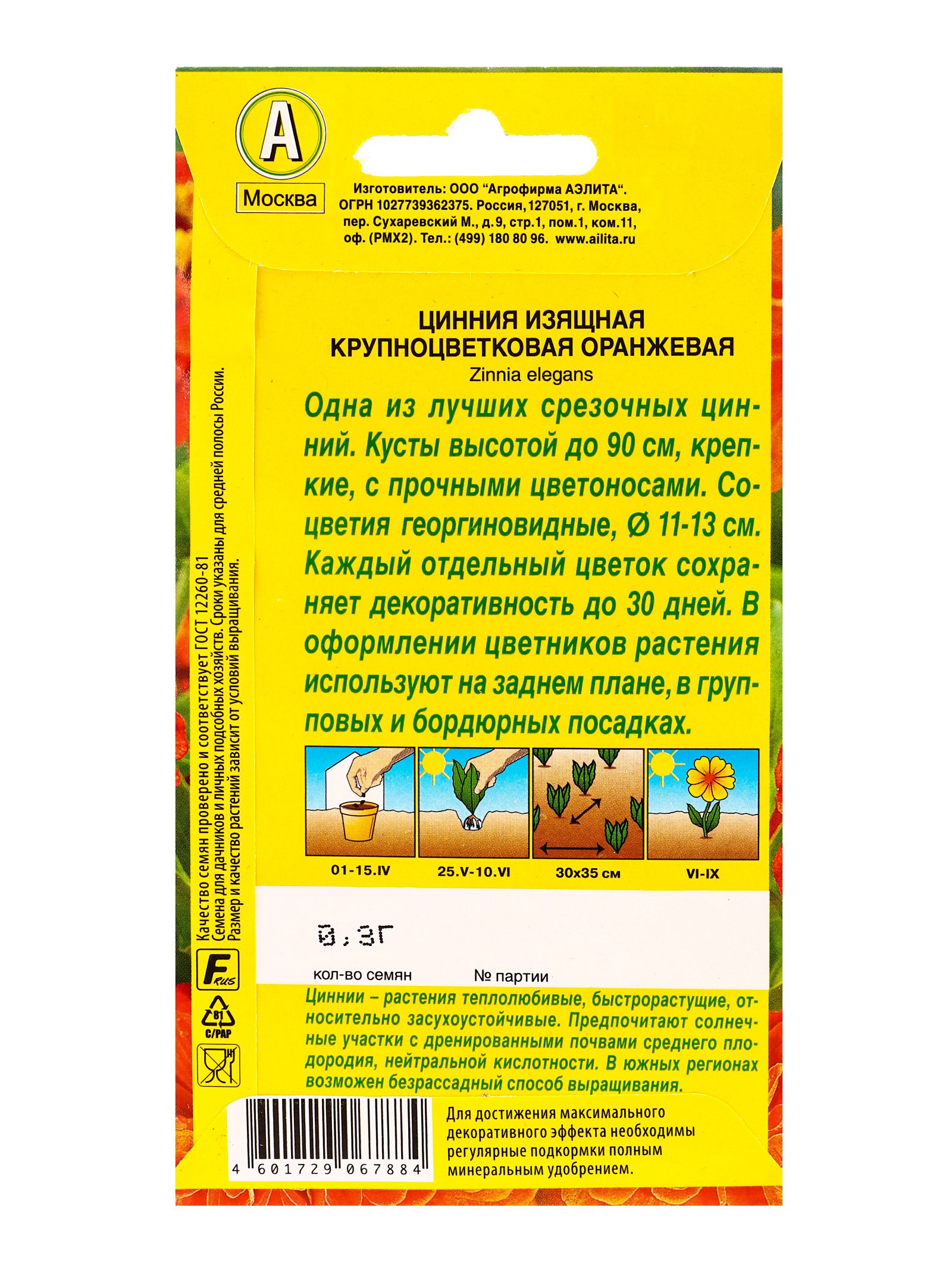 Семена цветов Цинния Крупноцветковая оранжевая, Ц/П,0.3 г, Агрофирма АЭЛИТА, Нидерланды