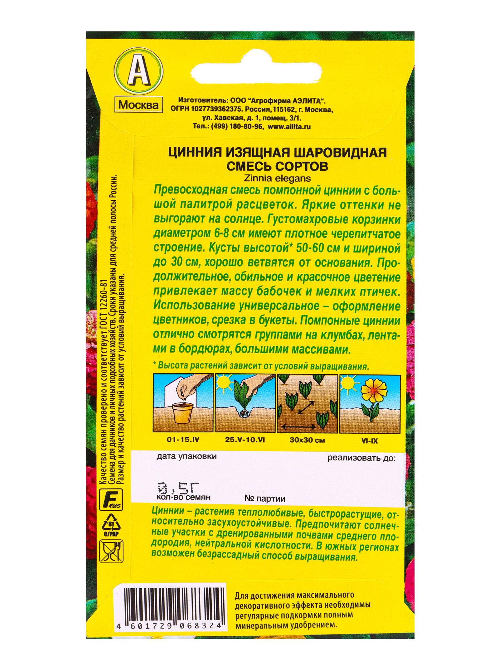 Набор семян Цинния Шаровидная, смесь окрасок, О, 5 шт., 9x17x1 см., Мой выбор, Россия