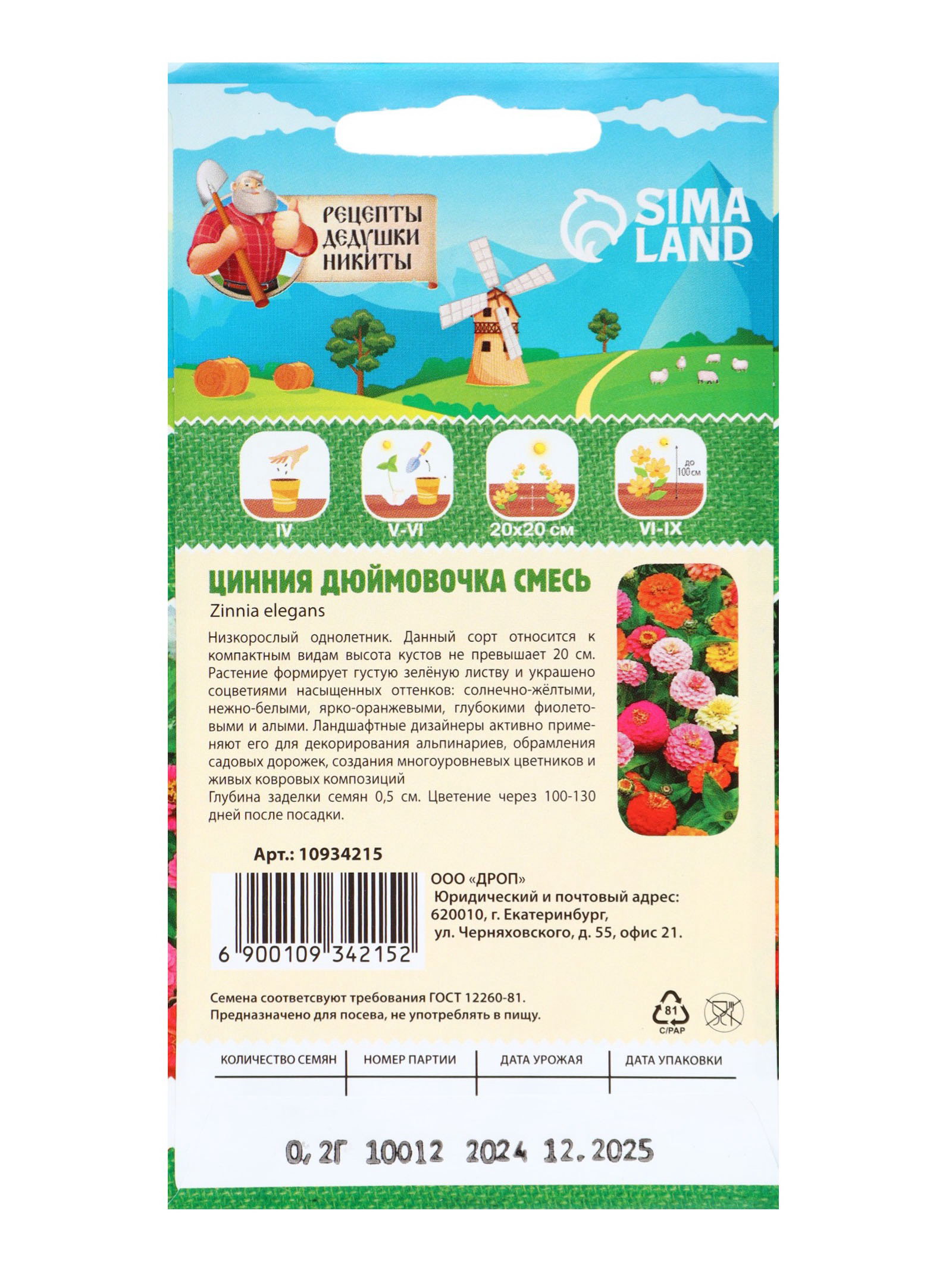 Семена цветов Цинния "Дюймовочка", 0.2 г, 10x17x1 см., Рецепты дедушки Никиты, Россия