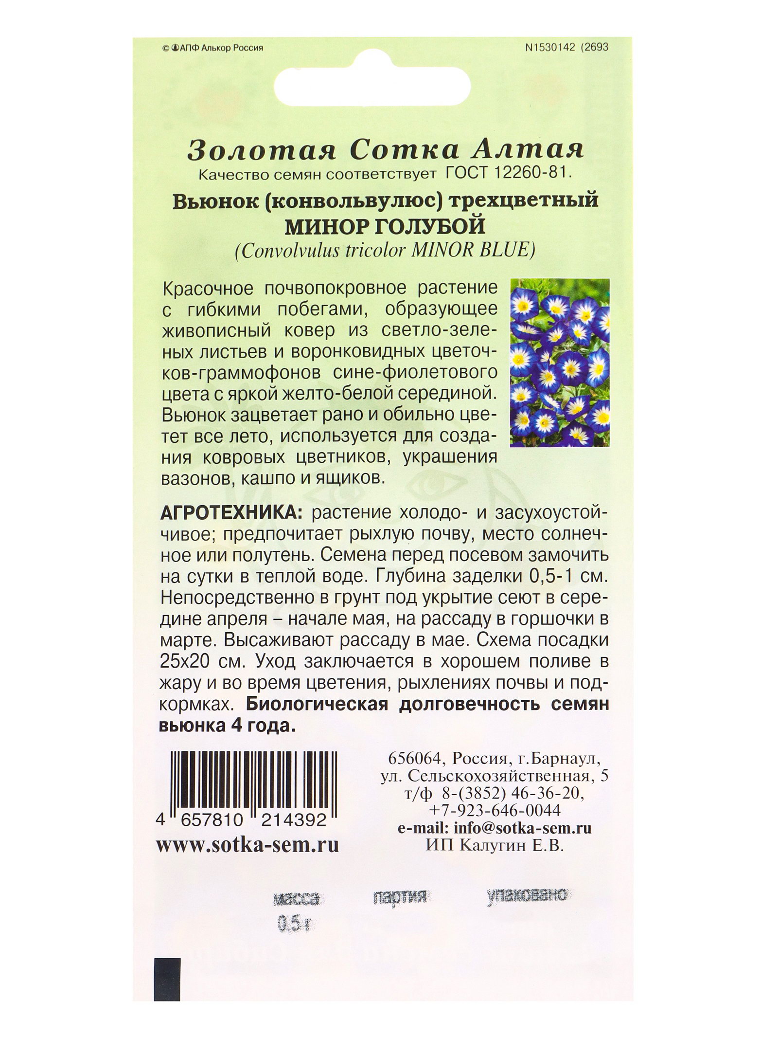 Семена Вьюнок "Минор Голубой", 0.5 г, трёхцветный, Золотая Сотка Алтая, Россия