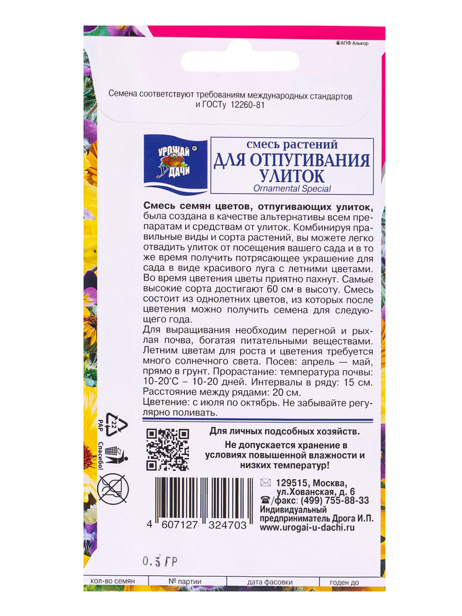 Семена цветов Смесь ДЛЯ ОТПУГИВАНИЯ УЛИТОК 0.5 гр, УРОЖАЙ УДАЧИ, Россия