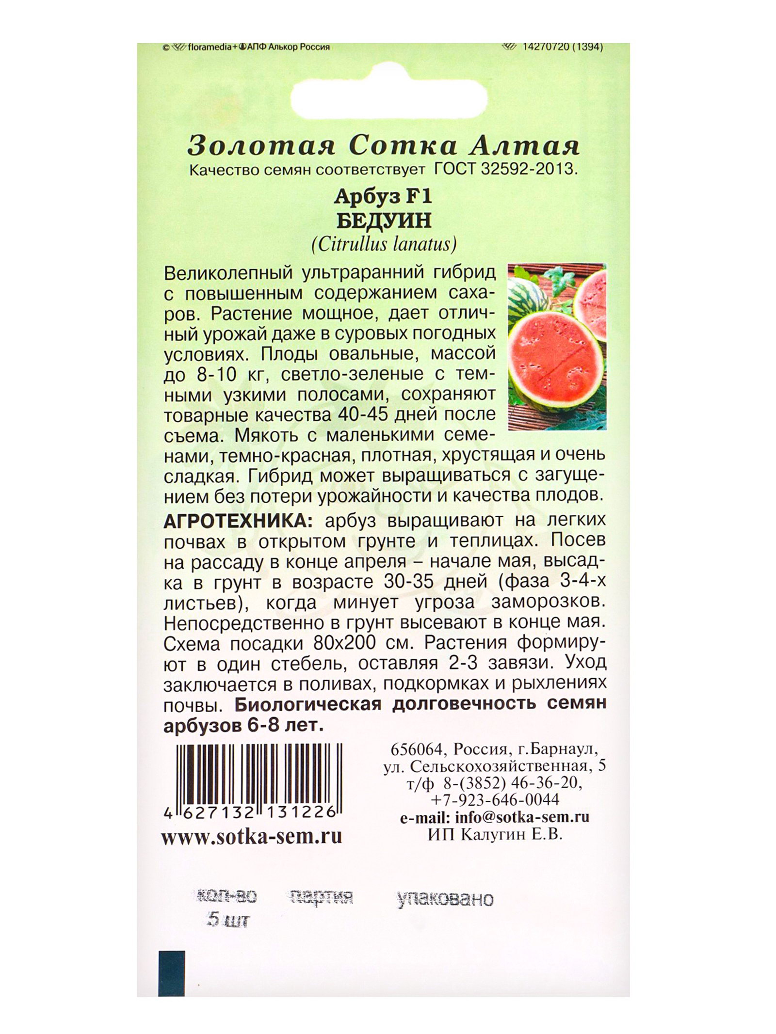 Семена Арбуз "Бедуин", F1, 5 шт., ультраранний, селекция Bejo Zaden, Золотая Сотка Алтая, Россия