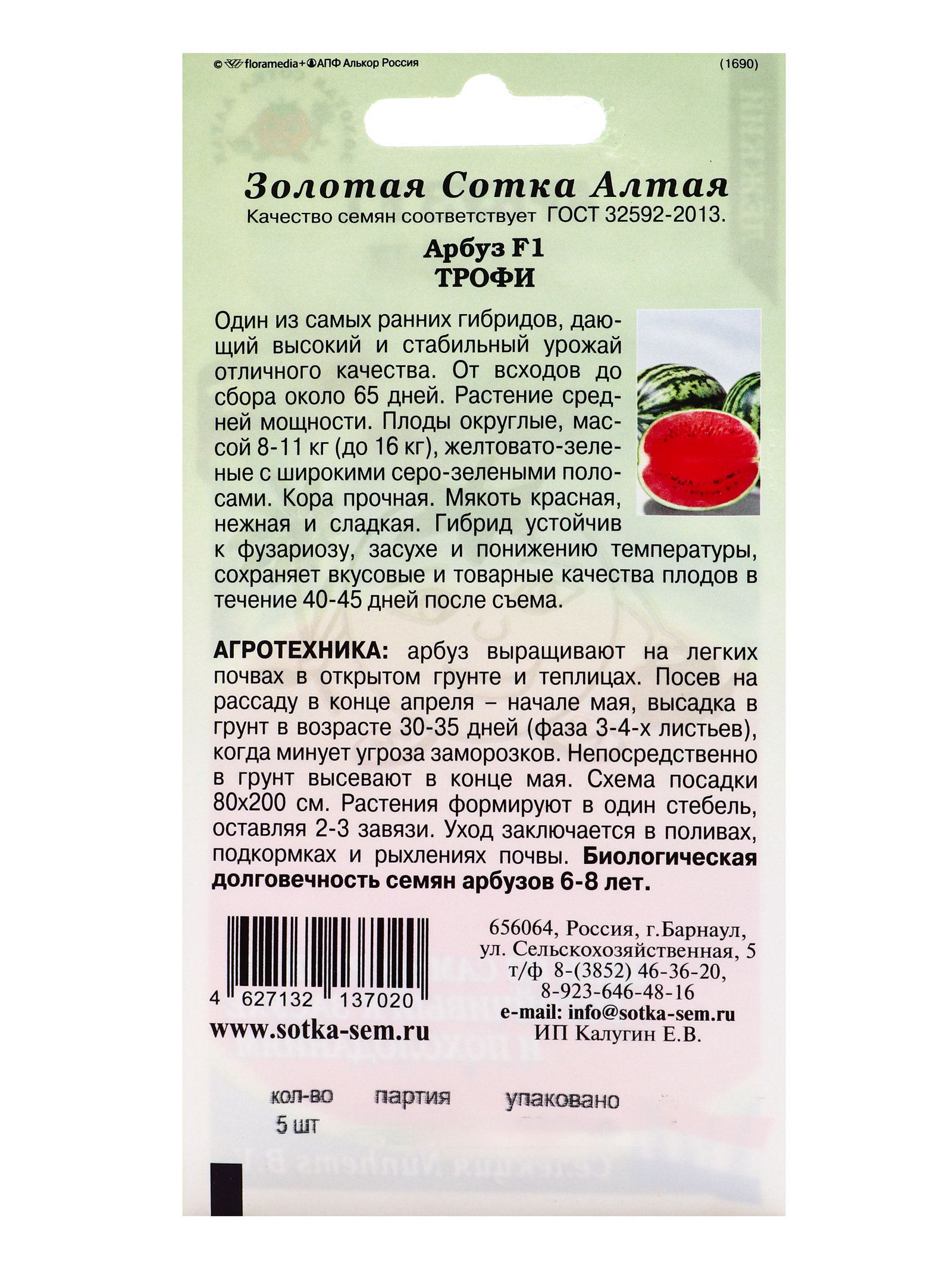 Семена Арбуз "Трофи", F1, 5 шт., ультраранний, селекция Nunhems B.V., Золотая Сотка Алтая, Россия