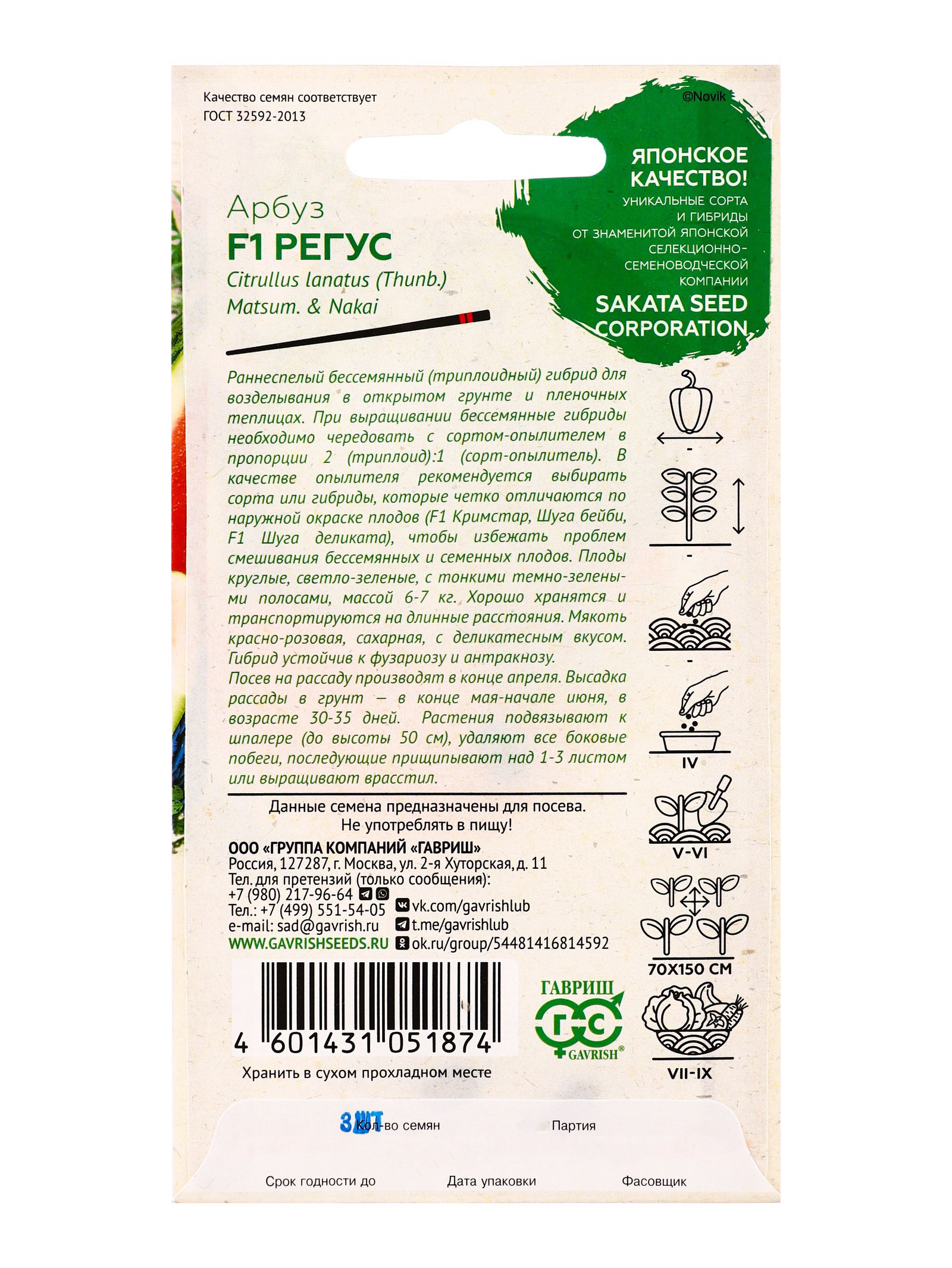 Семена Арбуз "Регус", F1, 3 шт., бессемянный, Sakata, Гавриш, Россия