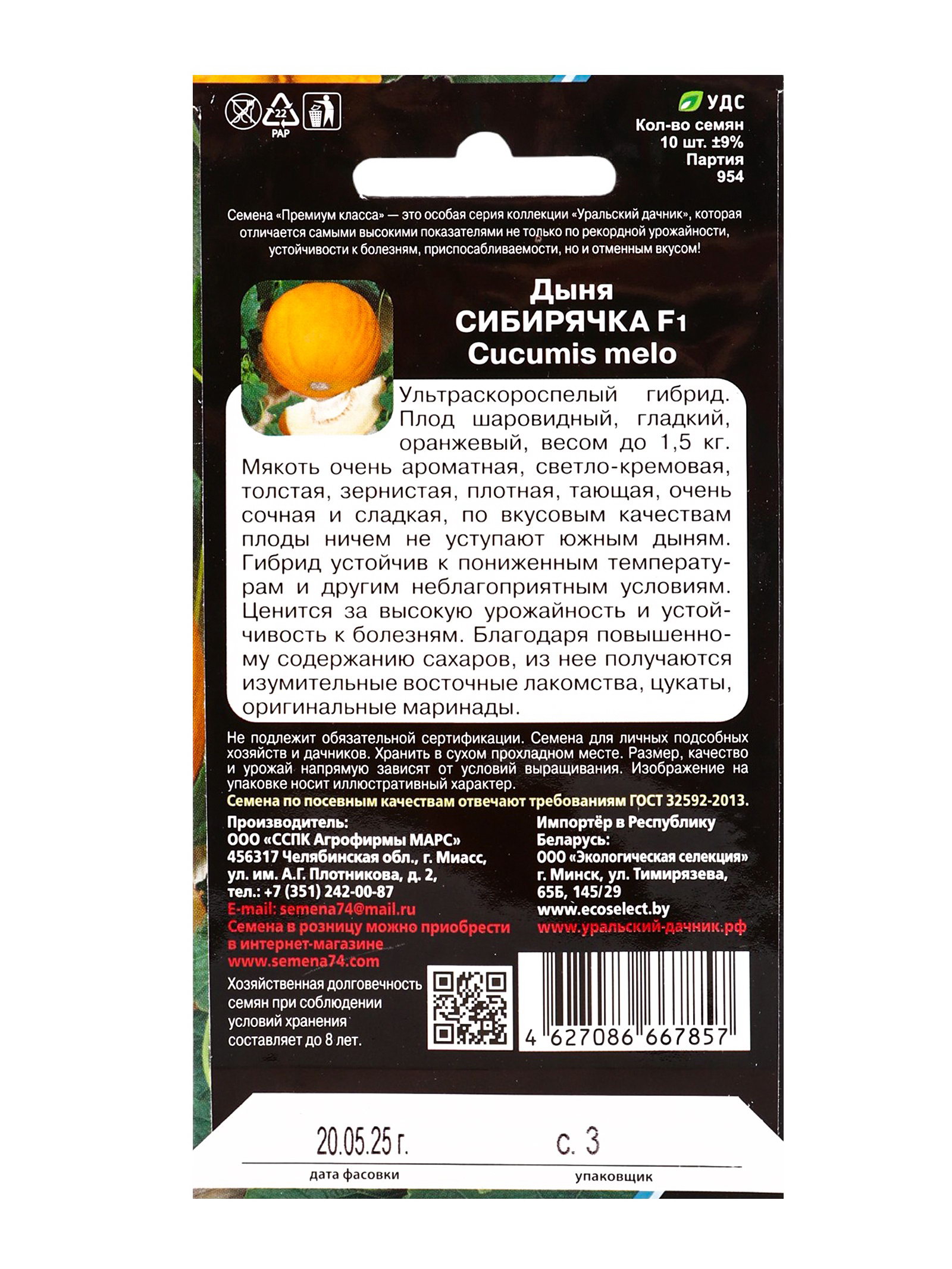 Посев на рассаду: Апрель, Май Посев (посадка) в грунт: Июнь, Май Размер упаковки: 8 x 0.1 x 15 см. Место выращивания: Открытый грунт Нуждаются ли в стратификации: Нет Нуждаются ли в стратификации: Нет tnved: 1207700000 Температурное ограничение: Нет Цвет: Жёлтый Сроки созревания: Сверхранний (скороспелый) Ультраскороспелый гибрид. Плод шаровидный, гладкий, оранжевый, весом до 1,5 кг Мякоть очень ароматная, светло-кремовая, толстая, зернистая, плотная, тающая, очень сочная и сладкая, по вкусовым качествам плоды ничем не уступают южным дыням. Гибрид устойчив к пониженным температурам и другим неблагоприятным условиям. Ценится за высокую урожайность и устойчивость к болезням. Благодаря повышенному содержанию сахаров, из нее получаются изумительные восточные лакомства, цукаты, оригинальные маринады. | ||