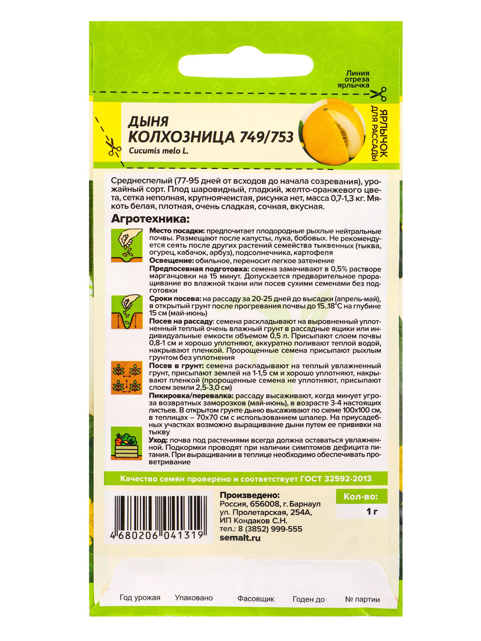 Семена Дыня "Колхозница 749/753", 1 г, Семена Алтая, Россия