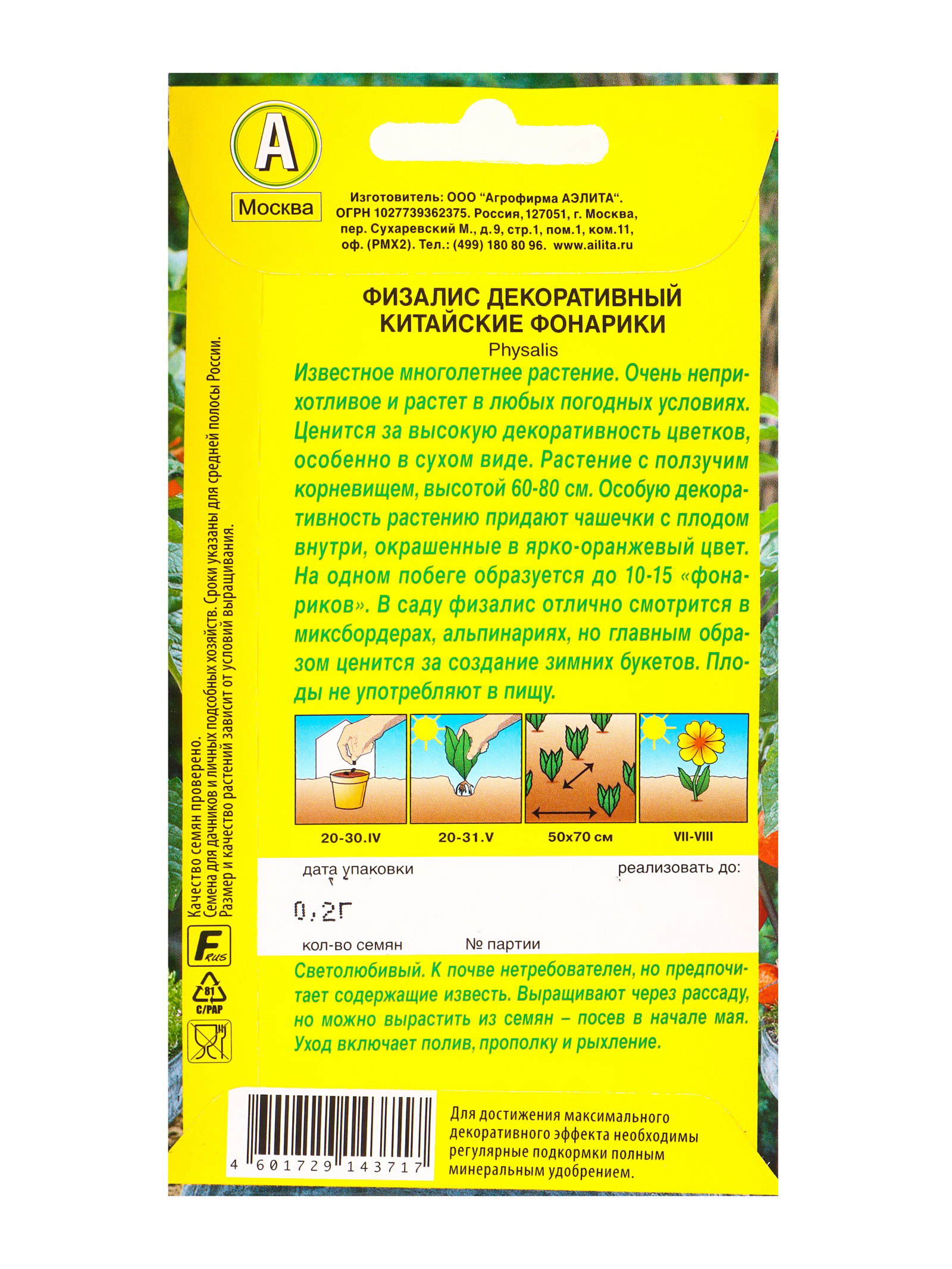 Семена цветов Физалис Китайские фонарики Мн, Ц/П,0.2 г, Агрофирма АЭЛИТА, Россия