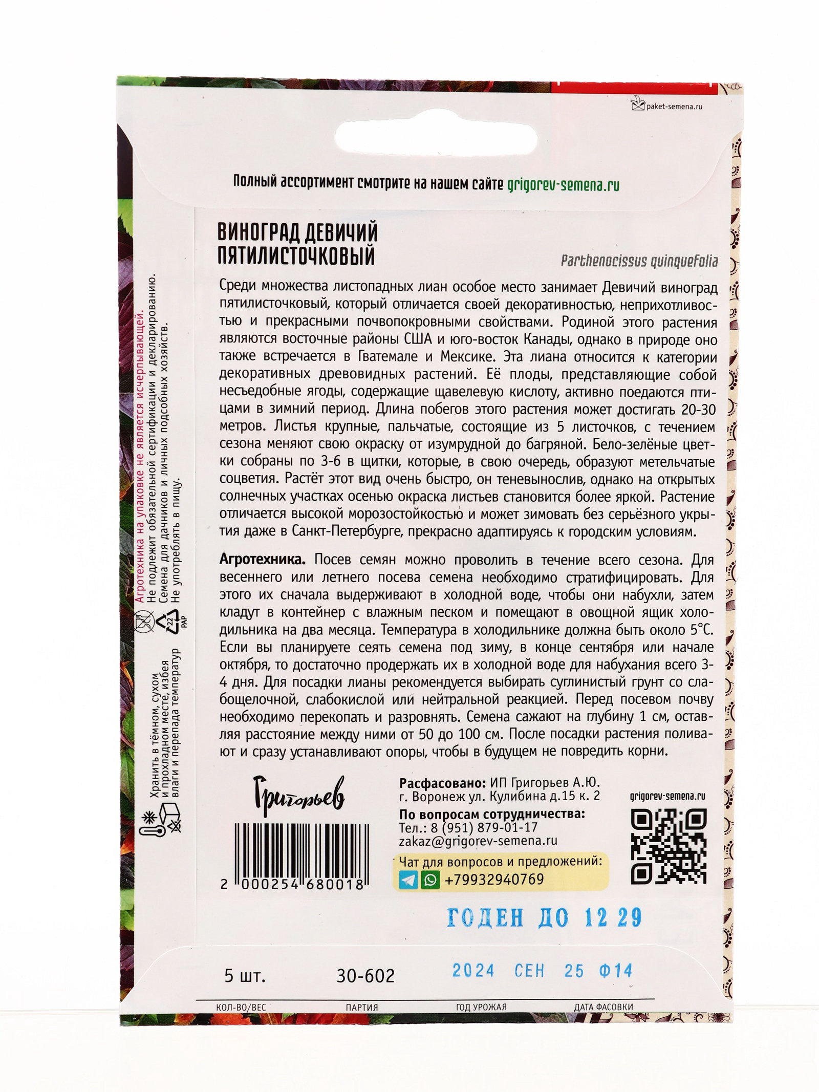 Семена Виноград Пятилисточковый девичий 5 шт. / 12.29 гр, Григорьев, Россия