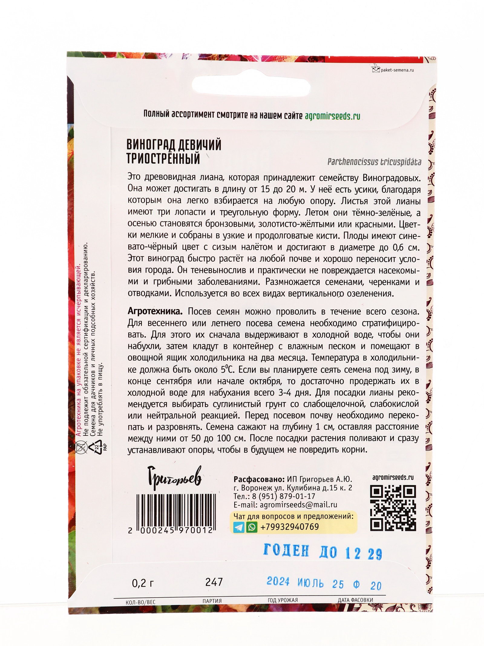 Семена Виноград Триостренный девичий 0.2 г / 12.29 гр, Григорьев, Россия