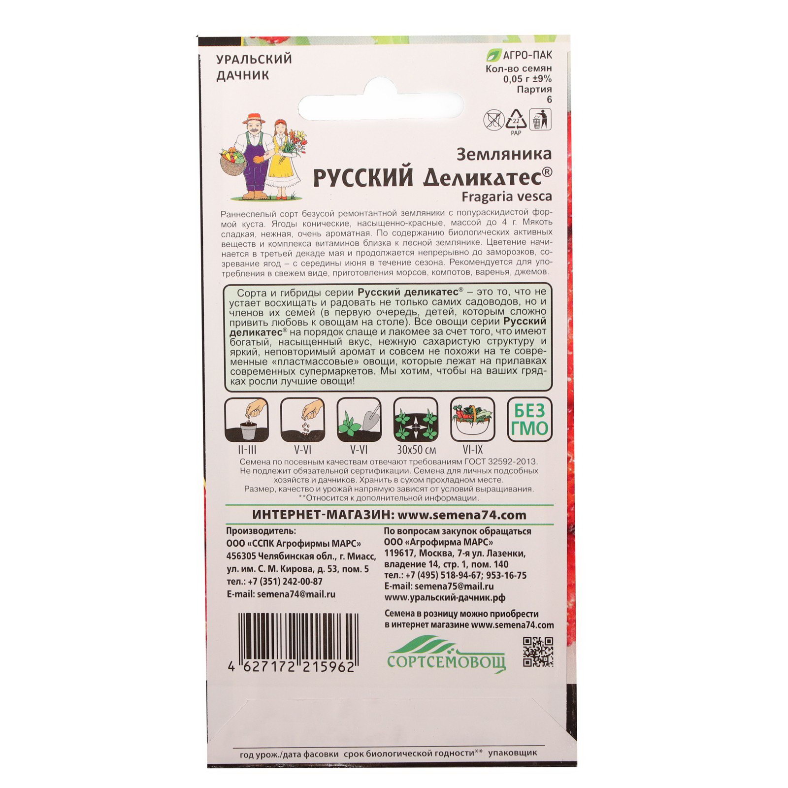 Семена Земляника "Русский деликатес", 0.05 г, Уральский Дачник, Россия