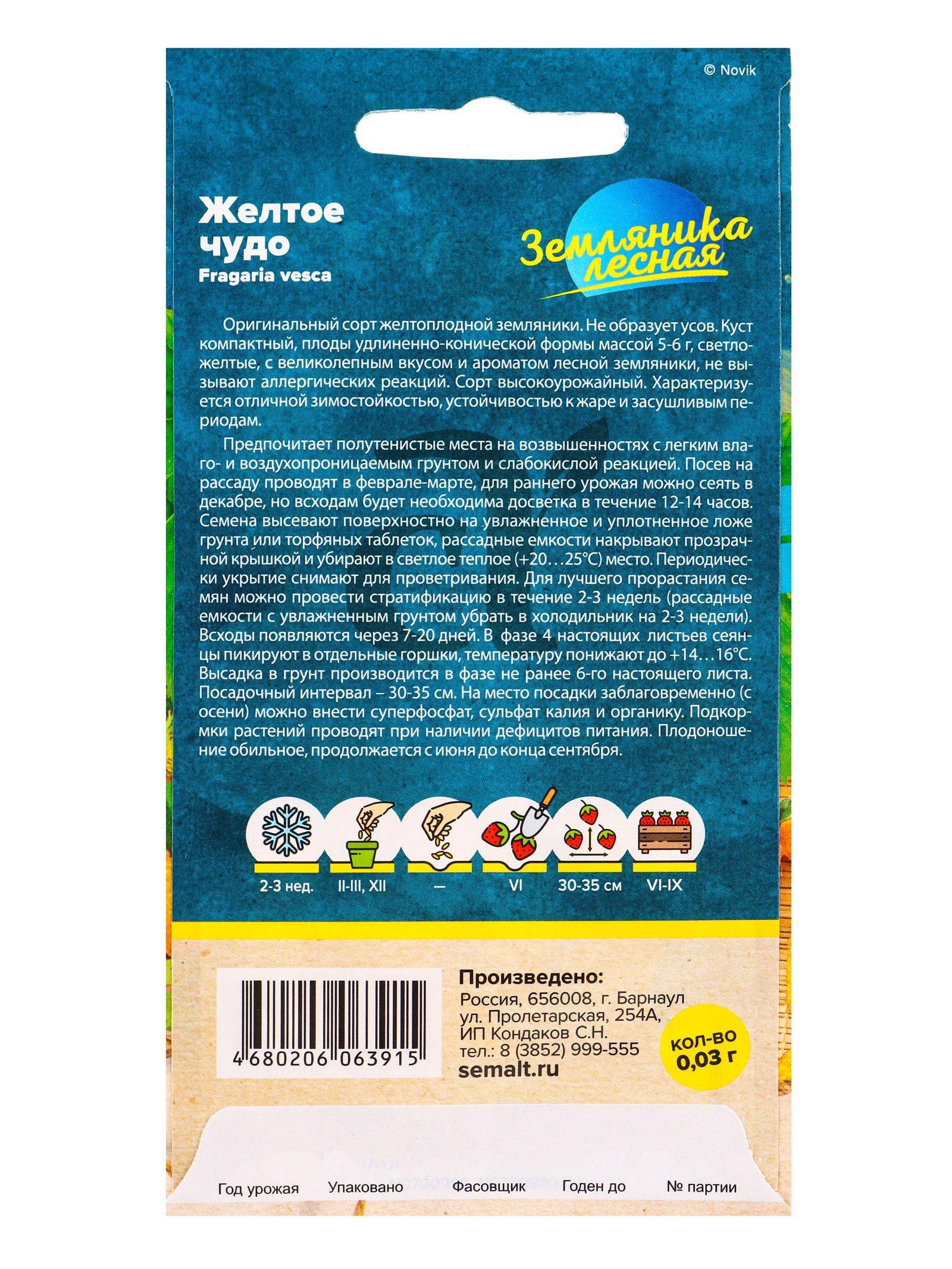 Семена Земляника Желтое чудо ремонтантная/Сем Алт/цп 0.03 гр, Семена Алтая, Россия