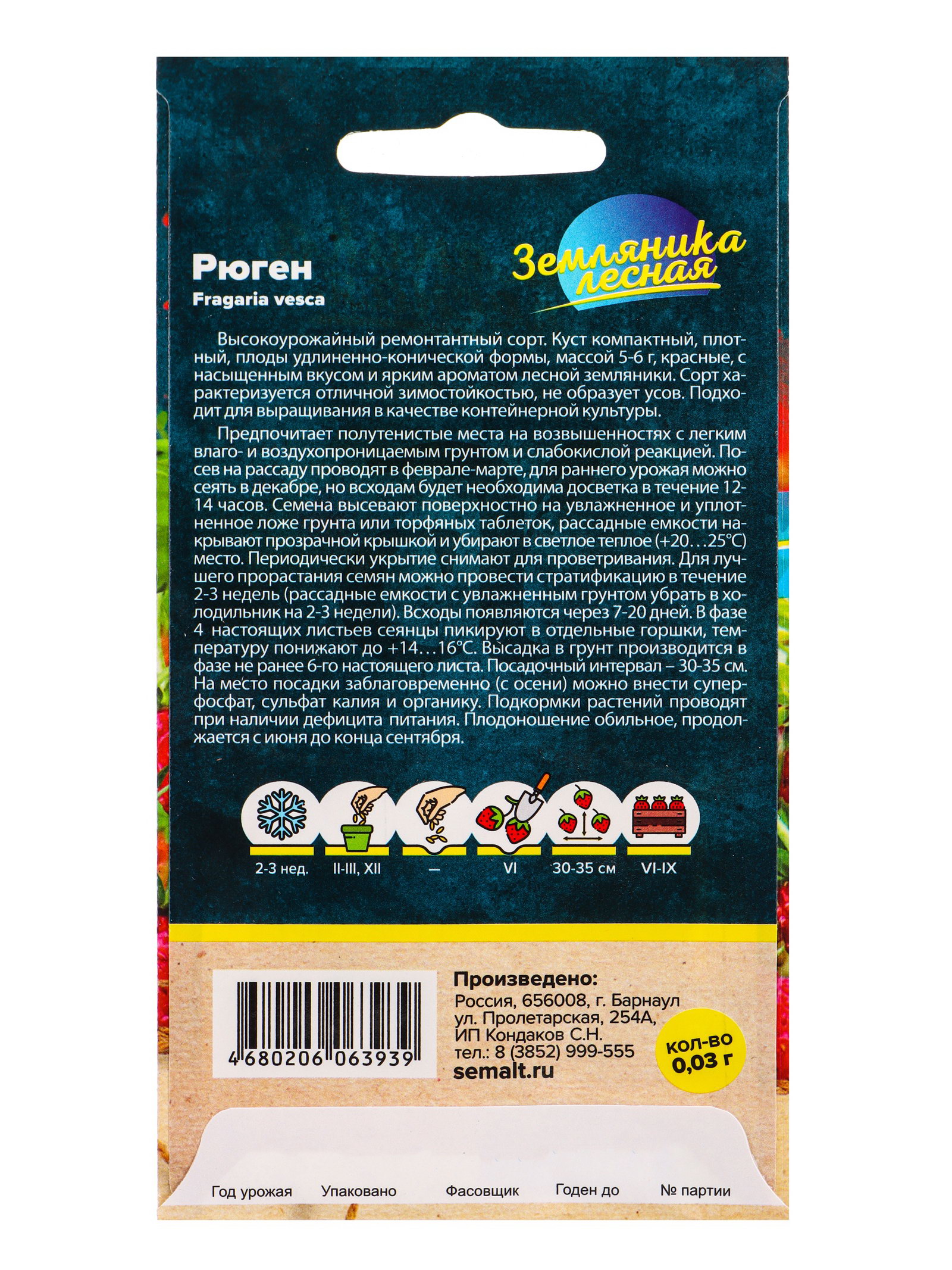 Семена Земляника Рюген ремонтантная/Сем Алт/цп 0.03 гр, Семена Алтая, Россия