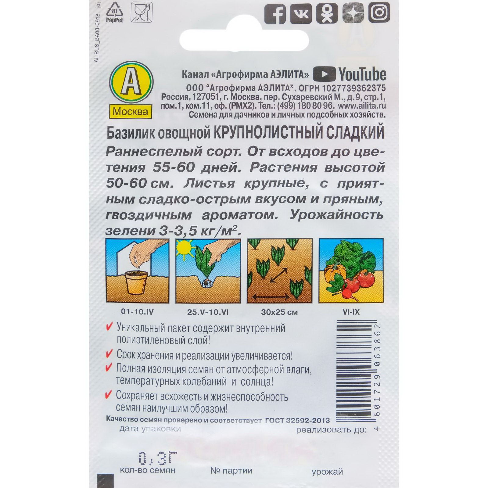 Семена Базилик овощной "Крупнолистный" сладкий "Лидер", 0.2 г, Агрофирма АЭЛИТА, Россия