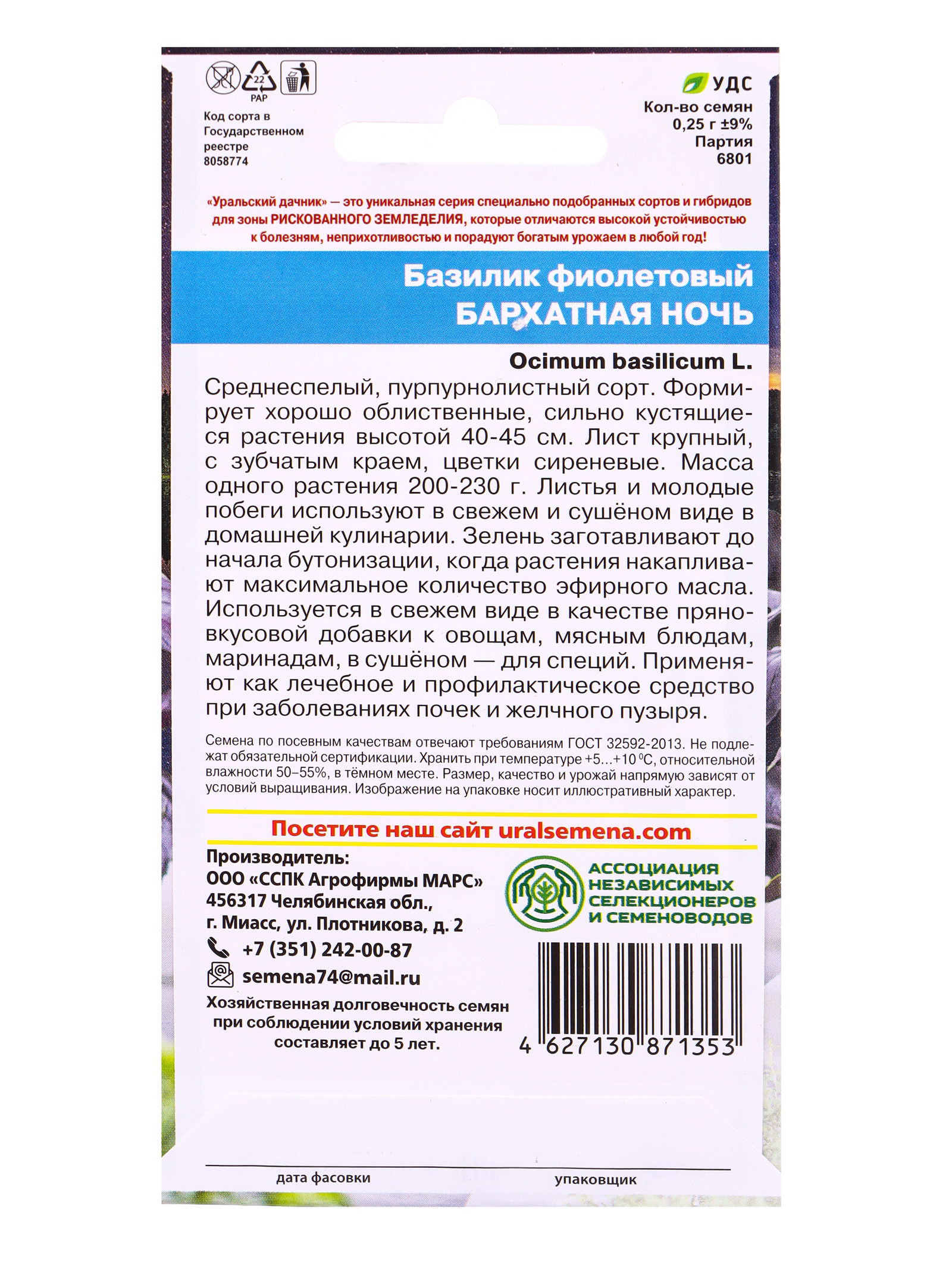 Семена Базилик "Бархатная ночь", фиолетовый, 0.25 г, "Уральский дачник", Уральский Дачник, Россия