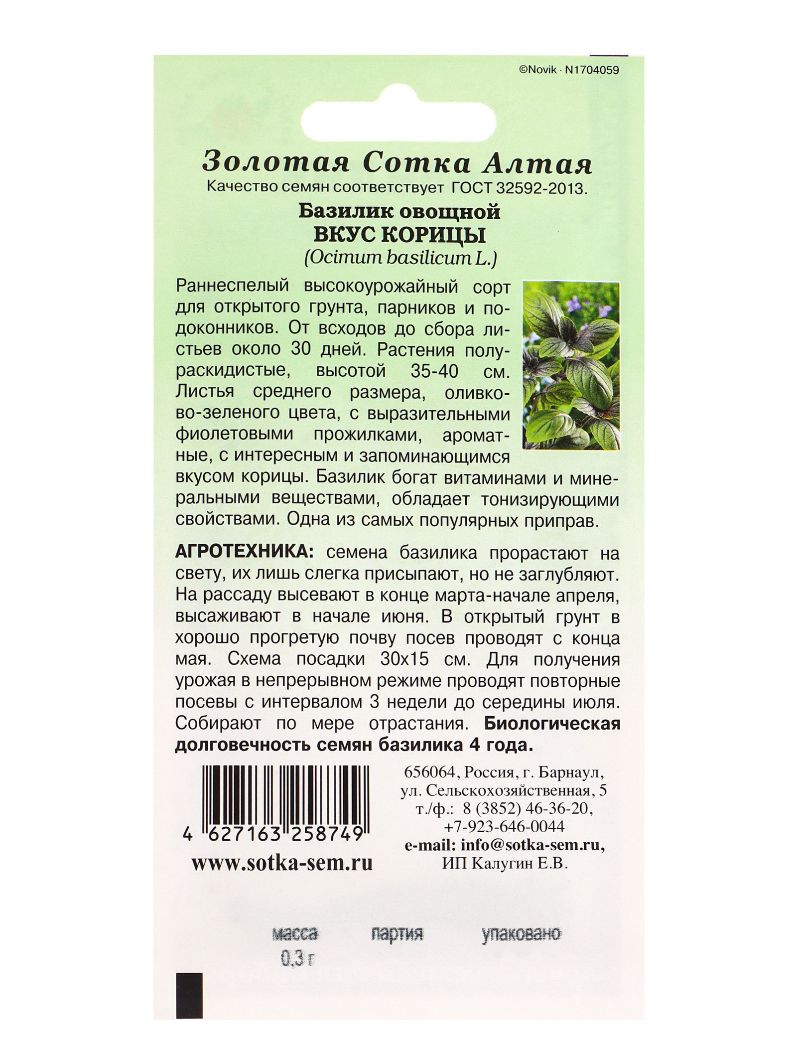 Семена Базилик Вкус Корицы /Сотка/ 0.3г/ раннесп. зелен. с фиол. прожил. 35-40см /*1200, Золотая Сотка Алтая, Россия