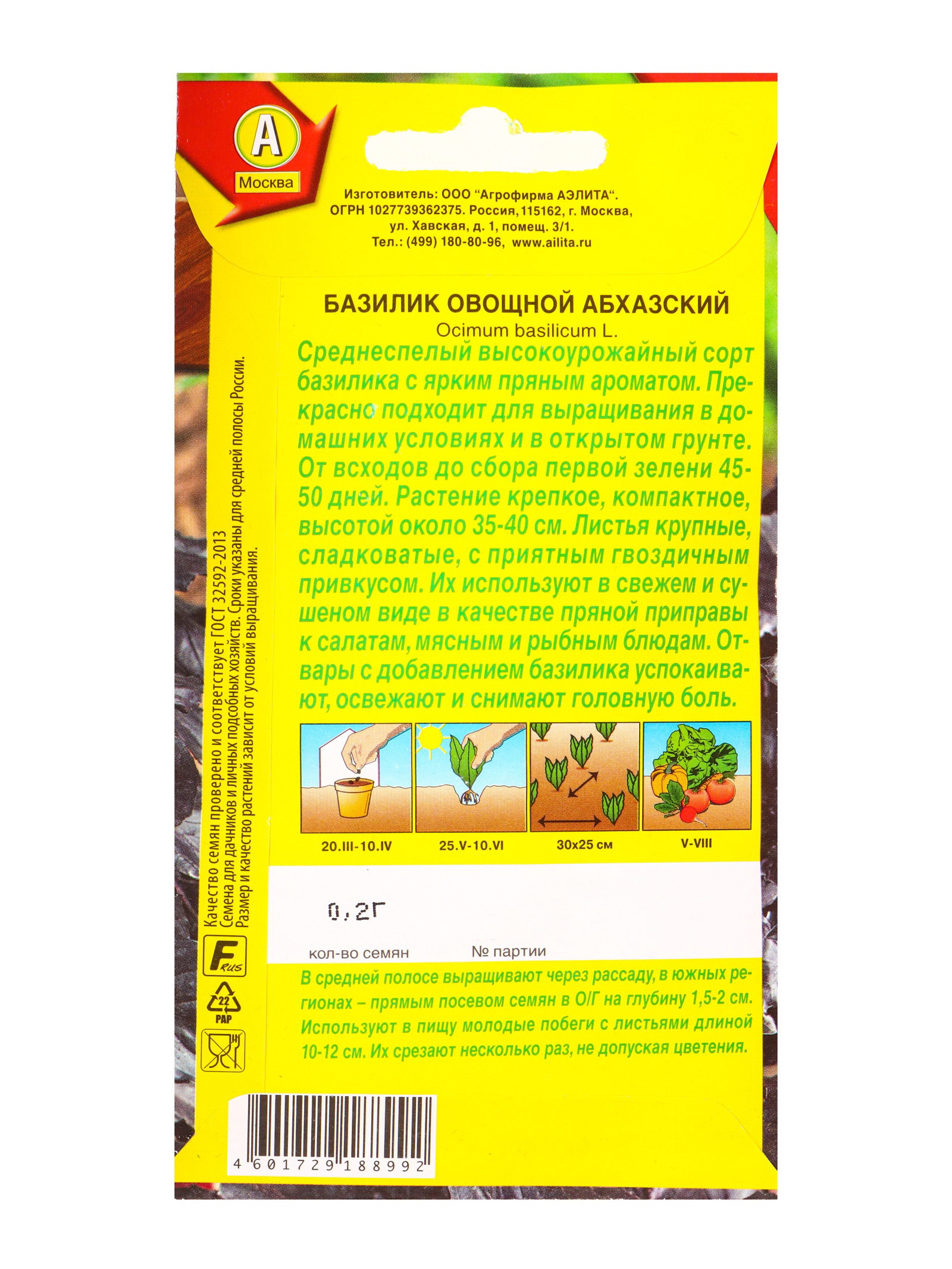Семена Базилик овощной Абхазский, Ц/П,0.2 г, Агрофирма АЭЛИТА, Россия