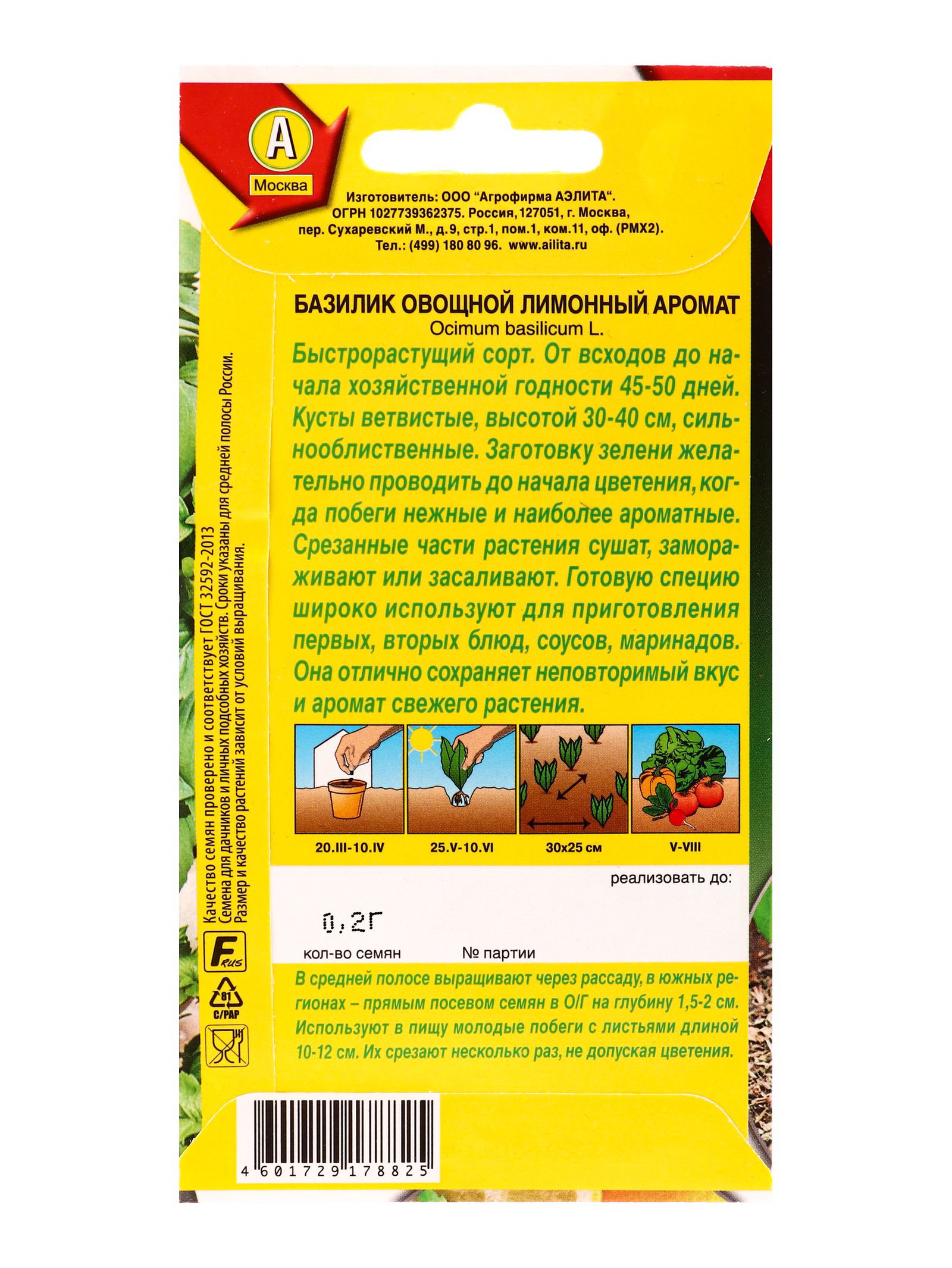 Семена Базилик овощной Лимонный аромат Популярные пряности, Ц/П,0.2 г, Агрофирма АЭЛИТА, Нидерланды