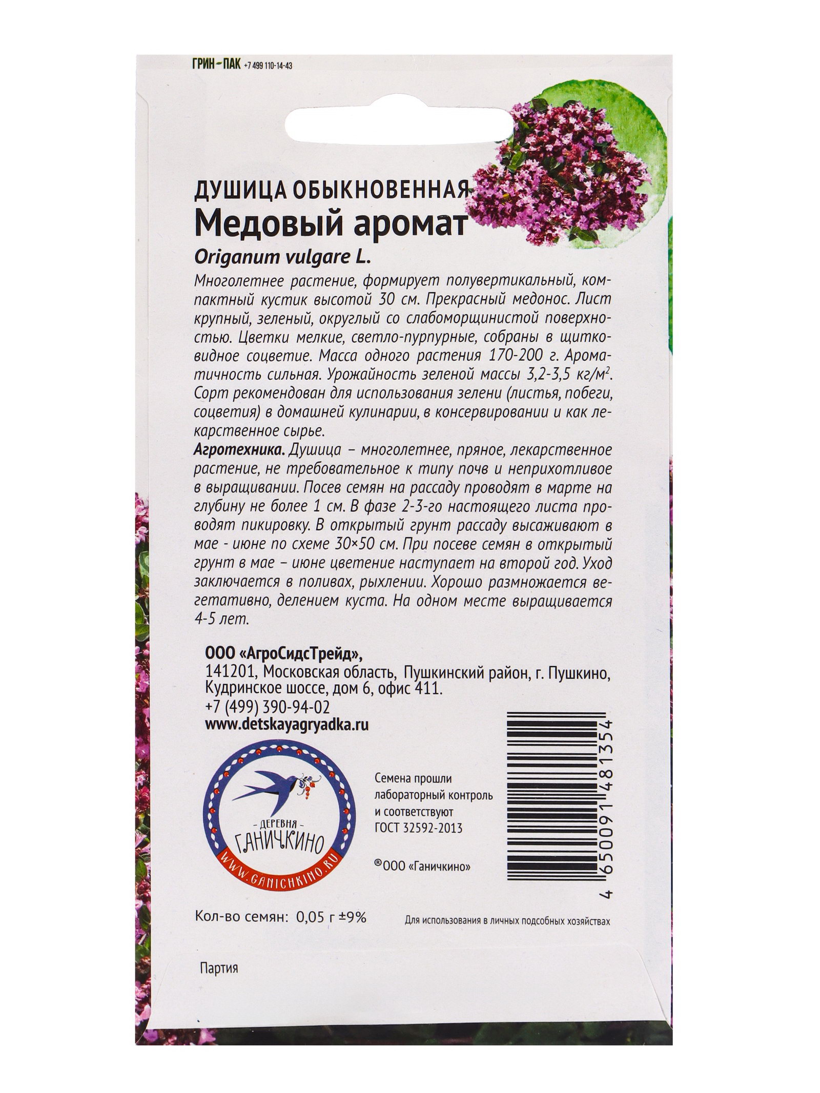 Размер упаковки: 8 x 0.2 x 15 см. Место выращивания: Открытый грунт Сроки созревания: Средний Вид: Душица tnved: 1209999900 tnved: 1209999900 Температурное ограничение: Нет Многолетнее растение, формирует полувертикальный, компактный кустик высотой 30 см Прекрасный медонос. Лист крупный, зеленый, округлый со слабоморщинистой поверхностью. Цветки мелкие, светло-пурпурные, собраны в щитковидное соцветие. Масса одного растения 170-200 гр Ароматичность сильная. Урожайность зеленой массы 3,2-3,5 кг/м2. Сорт рекомендован для использования зелени (листья, побеги, соцветия) в домашней кулинарии, в консервировании и как лекарственное сырье. Агротехника: Душица – многолетнее, пряное, лекарственное растение, не требовательное к типу почв и неприхотливое в выращивании. Посев семян на рассаду проводят в марте на глубину не более 1 см В фазе 2-3-его настоящего листа проводят пикировку. В открытый грунт рассаду высаживают в мае - июне по схеме 30x50 см При посеве семян в открытый грунт в мае – июне цветение наступает на второй год. Уход заключается в поливах, рыхлении. Хорошо размножается вегетативно, делением куста. На одном месте выращивается 4-5 лет. | ||