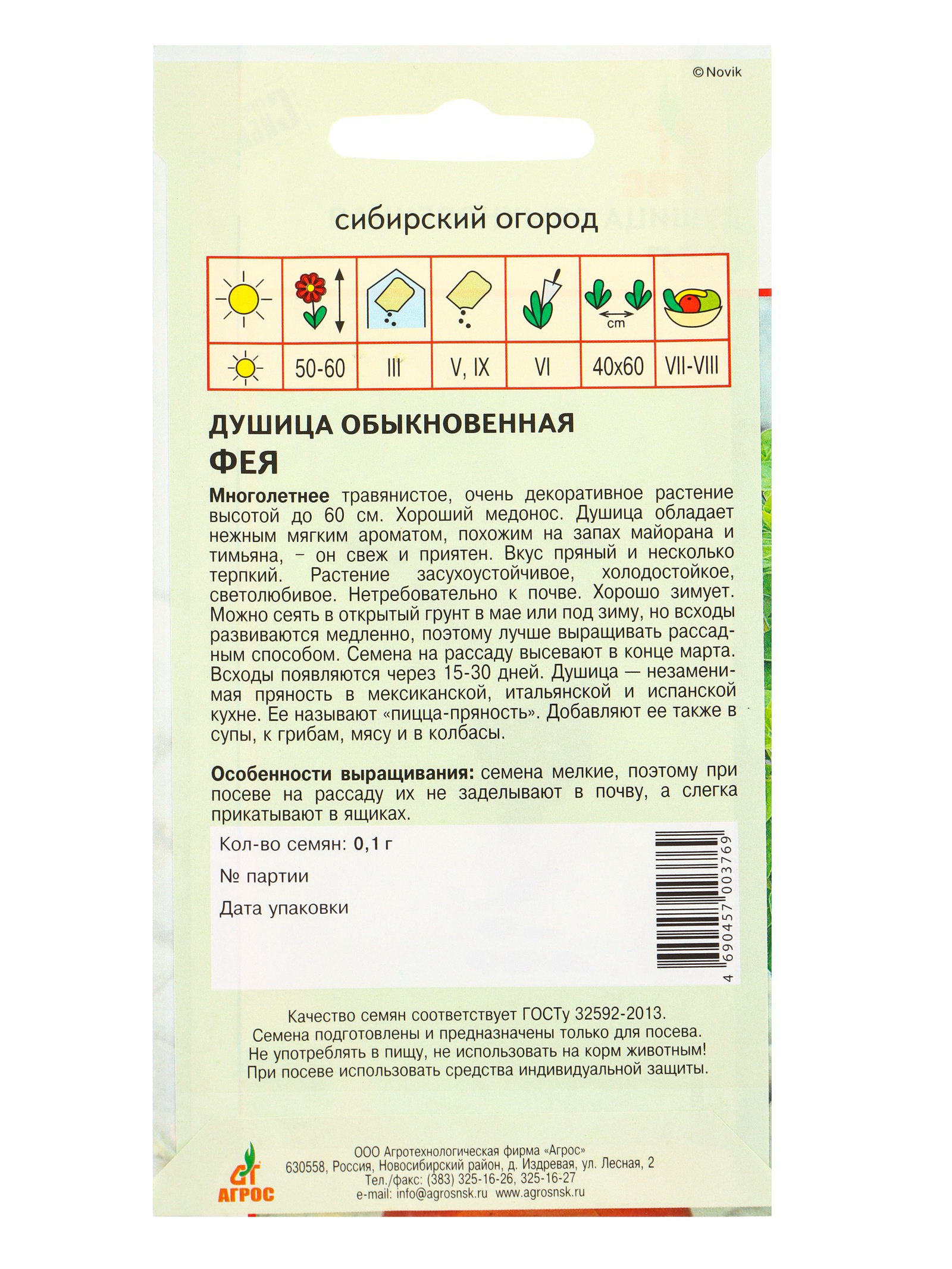 Семена Душица обыкновенная "Фея" 0.1 г, Агросс, Россия