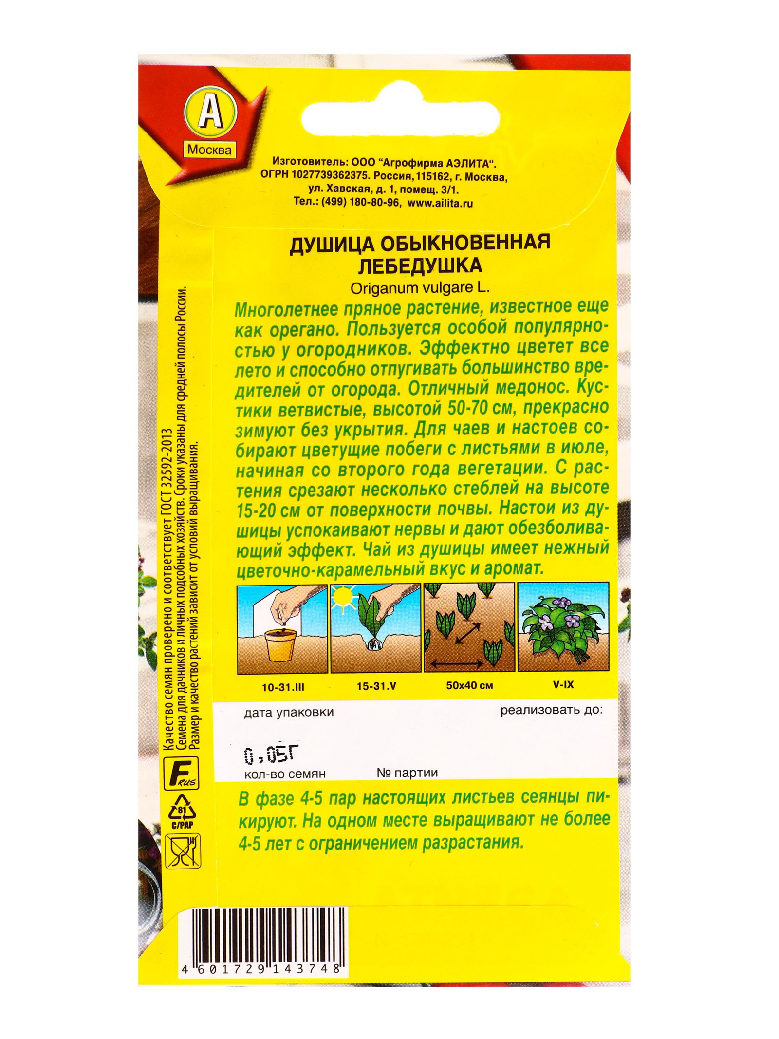 Семена Душица обыкновенная Лебедушка Целебный чай, Ц/П,0.05 г, Агрофирма АЭЛИТА, Россия