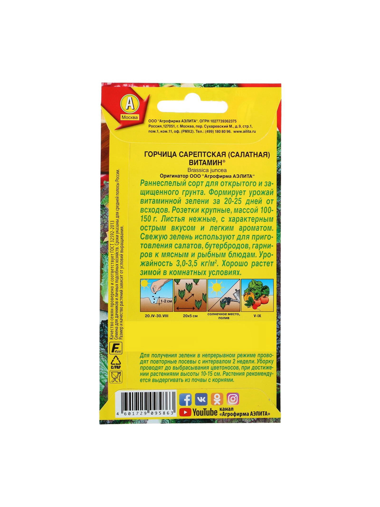Набор семян Горчица салатная "Витамин", 5 шт., 9x17x1 см., Мой выбор, Россия