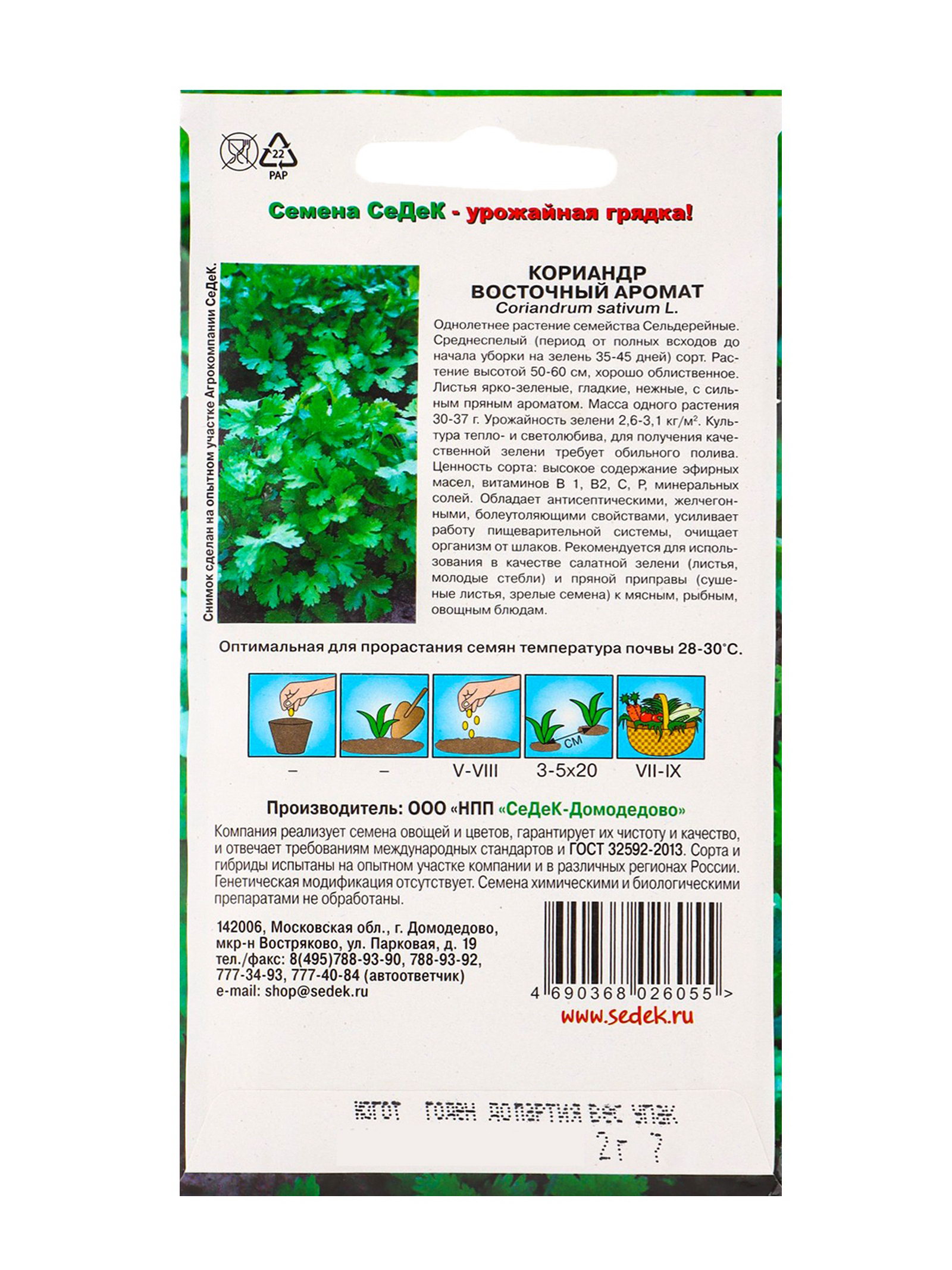 Применение: Душистые (на зелень, в салаты, в блюда), Лекарственная (лечебная), Пряная (в чай, к блюдам) Посев на рассаду: Март, Февраль Посев (посадка) в грунт: Апрель, Май Размер упаковки: 8 x 0.2 x 15 см. tnved: 1209999900 Можно выращивать на подоконнике: Да Сроки созревания: Средний Вид: Кориандр Место выращивания: Универсальный Температурное ограничение: Нет Однолетнее растение семейства Сельдерейные. Среднеспелый (период от полных всходов до начала уборки на зелень 35-45 дней) сорт. Растение высотой 50-60 см, хорошо облиственное. Листья ярко-зеленые, гладкие, нежные, с сильным пряным ароматом. Масса одного растения 30-37 гр Урожайность зелени 2,6-3,1 кг/м". Культура тепло- и светолюбива, для получения качественной зелени требует обильного полива. Ценность сорта: высокое содержание эфирных масел, витаминов В 1, В2, С, Р, минеральных солей. Обладает антисептическими, желчегонными, болеутоляющими свойствами, усиливает работу пищеварительной системы, очищает организм от шлаков. Рекомендуется для использования в качестве салатной зелени (листья, молодые стебли) и пряной приправы (сушеные листья, зрелые семена) к мясным, рыбным, овощным блюдам. | ||