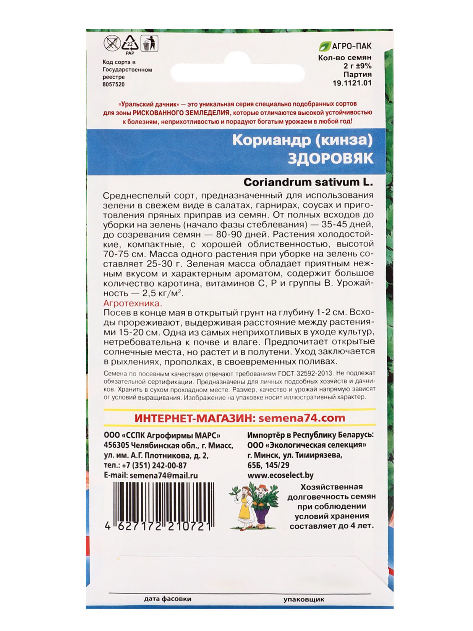 Посев (посадка) в грунт: Апрель, Май Применение: Душистые (на зелень, в салаты, в блюда), Пряная (в чай, к блюдам) Размер упаковки: 8 x 0.3 x 15 см. Место выращивания: Универсальный Сроки созревания: Средний Вид: Кориандр Можно выращивать на подоконнике: Да Зелени, особенно кинзы, много не бывает, ведь эта травка – необычайно эффектное дополнение к любому блюду: мясному, рыбному, овощному. Видимо, именно эту мысль преследовали селекционеры, когда создавали кориандр Здоровяк – такой пышной зеленью не может похвастать ни один другой представитель сородич зелёной культуры. Облиственность у растения ну очень богатая, при соблюдении агротехники высота куста доходит до 70-75 см, при этом он достаточно компактный. Главное в уходе: качественная почва , свет и полив. Сорт холодостойкий, поэтому если всё делать по правилам, никакая непогода не помешает урожайности, которая может доходить до 2,5 кг с 1 ?2. И поверьте, это только кажется, что много: за ушами так запищит, когда ваши домочадцы эту вкусную, пряно-ароматную, нежную, сочную травку распробуют, как бы соседи не оглохли. Сорт среднеспелый, массово зеленеть начинает через 35-45 дней после полных всходов, семена, из которых можно готовить улётно-запашистые приправы, появляются на 80-90 сутки. | ||