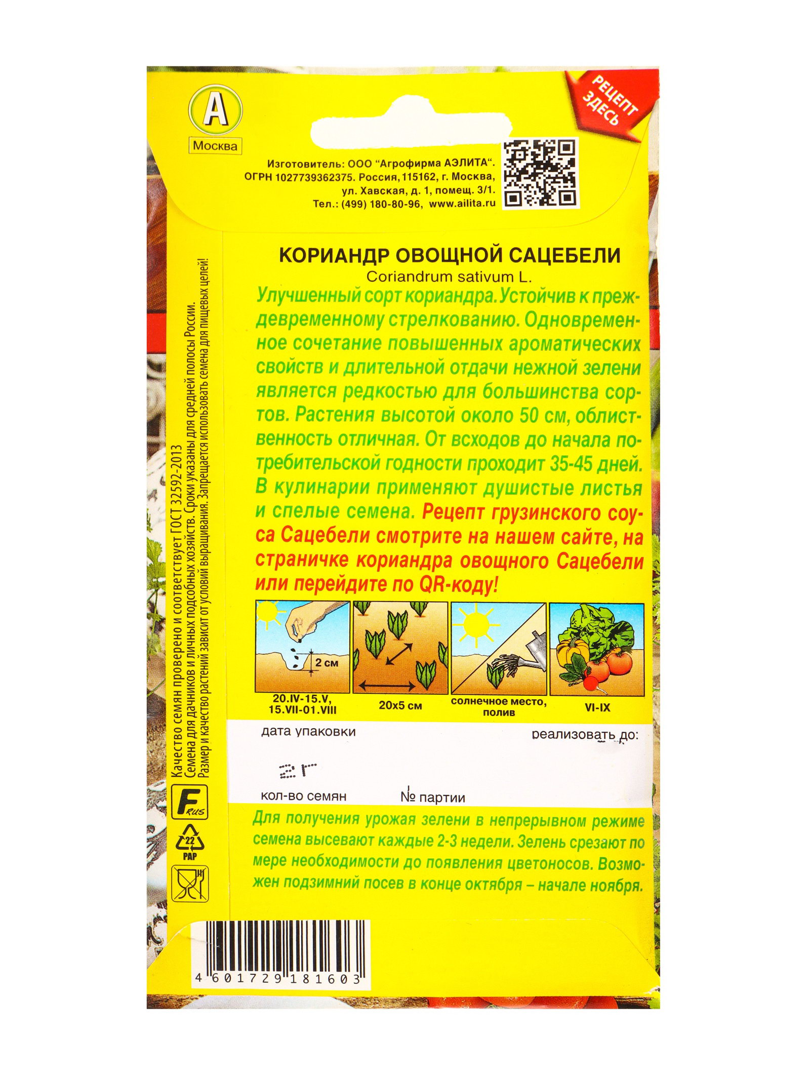 Семена Кориандр овощной Сацебели Блюда стран мира, Ц/П,2 г, Агрофирма АЭЛИТА, Россия