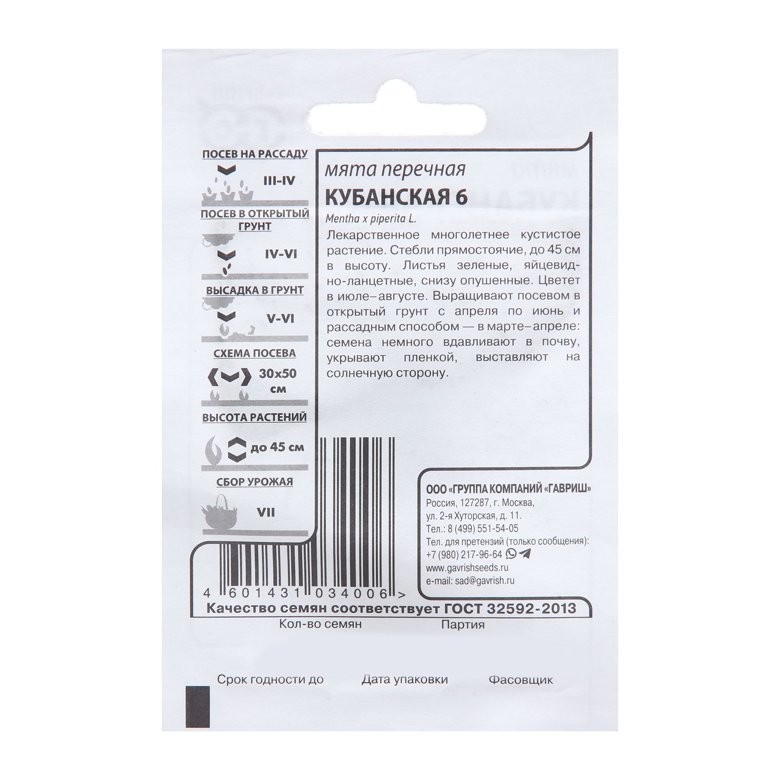 Семена Мята "Кубанская 6", 0.05 г б/п, Гавриш, Россия