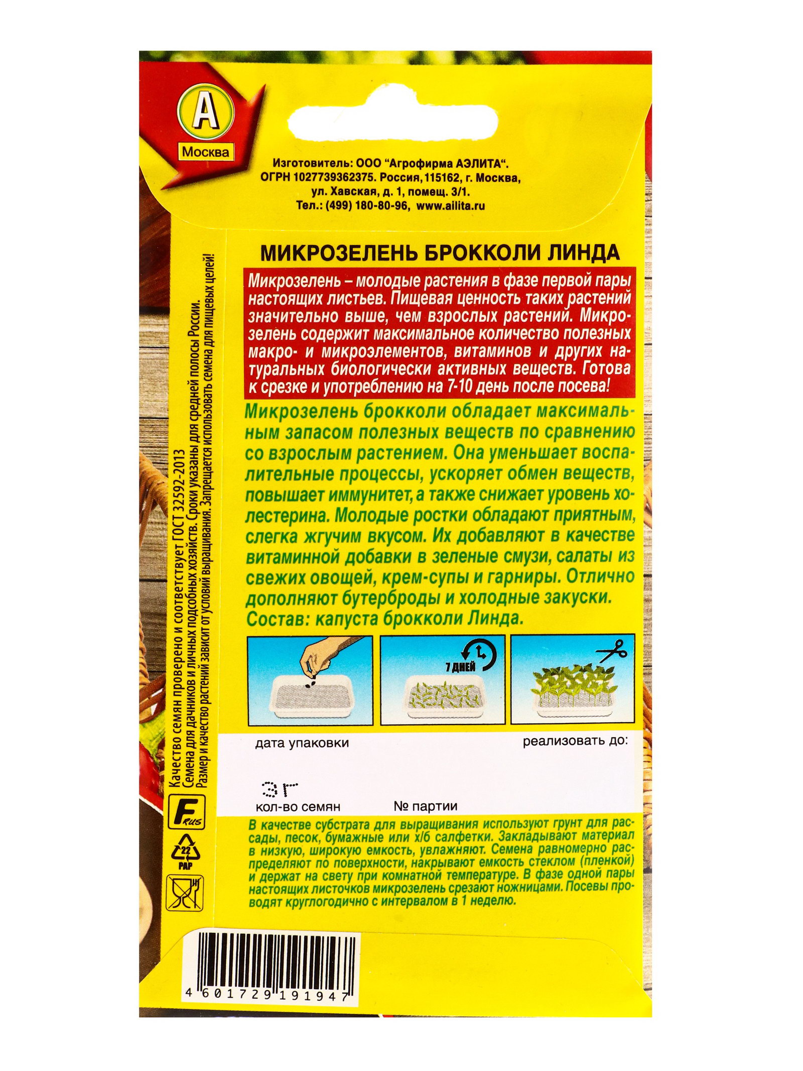 Семена Микрозелень Брокколи Линда, Ц/П,3 г, Агрофирма АЭЛИТА, Россия