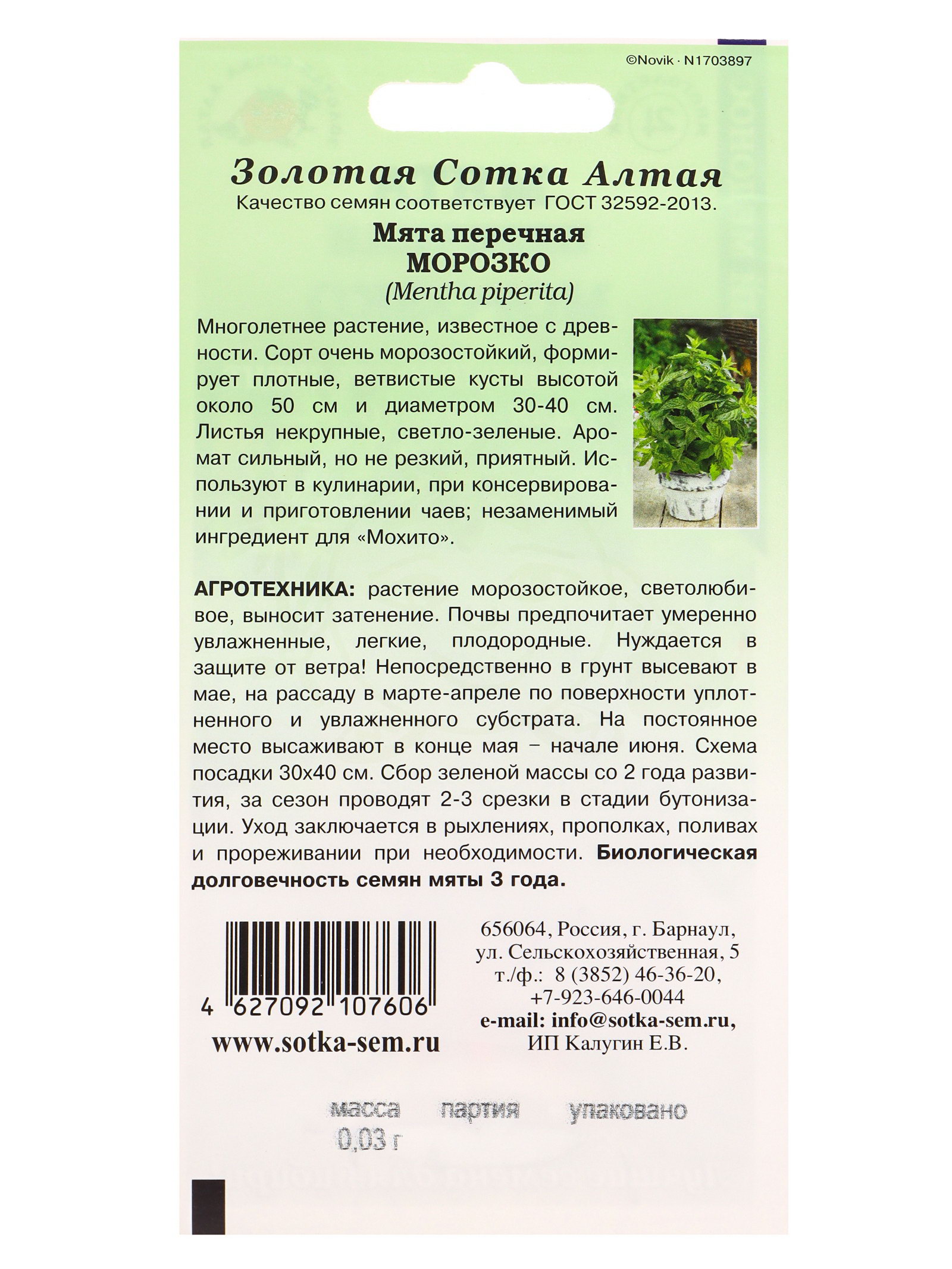 Семена Мята Морозко /Сотка/ 0.03г/ перечная многолет. до 50см /*1500, Золотая Сотка Алтая, Россия