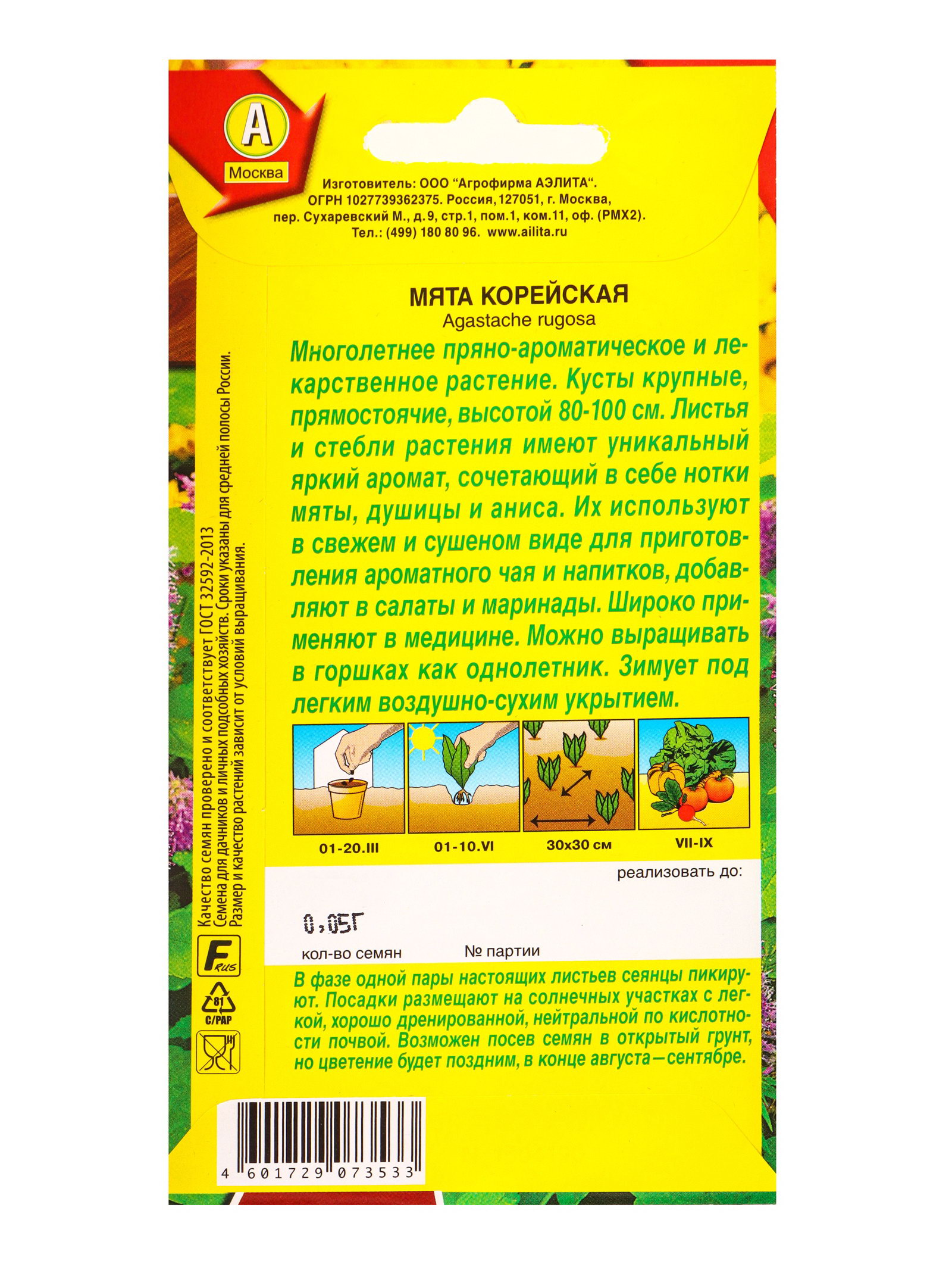 Семена Мята Корейская Лечебный огород, Ц/П,0.05 г, Агрофирма АЭЛИТА, Россия