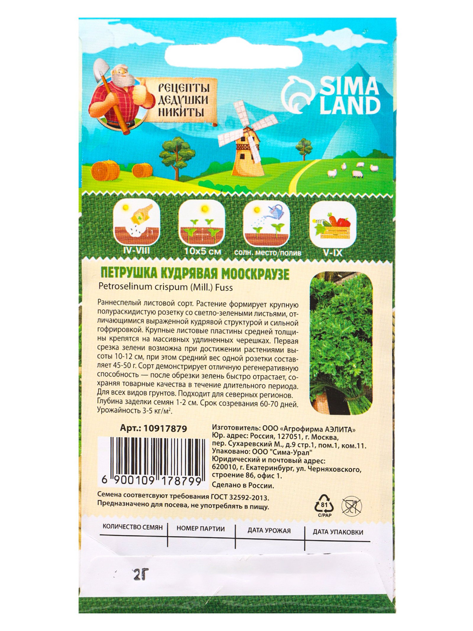 Семена Петрушка кудрявая "Мооскраузе", 2 г, 7x15x1 см., Рецепты дедушки Никиты, Россия