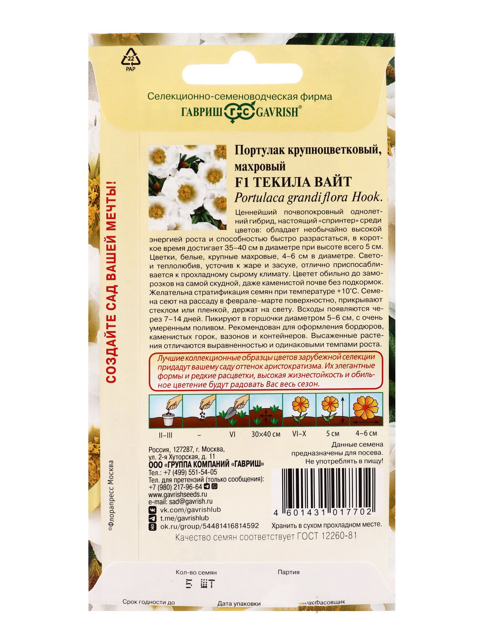 Семена цветов Портулак Текила Вайт F1* 5 шт серия Элитная клумба, Гавриш, Россия